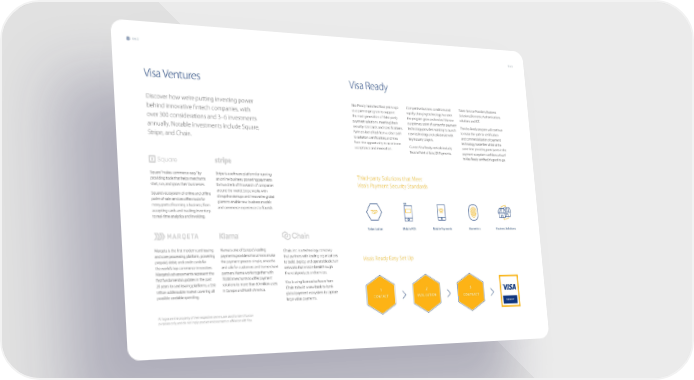 062 063 Visa Ventures Visa Ready Discover how we’re putting investing power Visa Ready launched four years ago Competitive business conditions and Token Service Providers, Business behind innovative fintech companies, with as a partner program to support rapidly changing technology has seen Solutions, Biometric Authentications the next generation of third-party the program grow and evolve. It is now solutions and IOT. over 300 considerations and 3–6 investments payment solutions, meeting Visa’s our primary point of contact for payment The Visa Ready program will continue security standards and specifications. technology providers wanting to launch to make the path to certification annually. Notable investments include Square, Partners benefited from a clear path new technology and collaborate with and commercialization of payment Stripe, and Chain. to solution certification; and Visa key industry players. technology hassle free whilst at the from the opportunity to accelerate Current Visa Ready verticals include; same time providing participants in the acceptance and innovation. Mobile Point of Sale, QR Payments, payment ecosystem confidence that if its Visa Ready certified, it’s good to go. Square “makes commerce easy” by Stripe is a software platform for running Third-party Solutions that Meet providing tools that helps merchants an online business, powering payments Visa's Payment Security Standards start, run, and grow their businesses. for hundreds of thousands of companies Square’s ecosystem of online and offline around the world. Stripe works with point-of-sale services offers tools for disruptive startups and innovative global many parts of running a business, from giants to enable new business models accepting cards and tracking inventory, and commerce experiences to flourish. TSP to real-time analytics and invoicing. Tokenization Mobile POS Mobile Payments Biometrics Business Solutions Marqeta is the first modern card issuing Klarna is one of Europe’s leading Chain, Inc. is a technology company and core processing platform, powering payments providers that aims to make that partners with leading organizations prepaid, debit, and credit cards for the payment process simple, smooths to build, deploy, and operate blockchain Visa’s Ready Easy Set Up the world’s top commerce innovators. and safe for customers and its merchant networks that enable breakthrough Marqeta’s advancements represent the partners. Klarna works together with financial products and services. first fundamental updates in the past 70,000 merchants to offer payment 20 years to card issuing platforms, a $30 solutions to more than 60 million users Visa is using licensed software from trillion addressable market covering all in Europe and North America. Chain to build a new bank-to-bank possible cardable spending. global payment ecosystem to capture 1 2 3 large-value payments. CONTACT EVALUATION CONTRACT All logos are the property of their respective owners, are used for identification purposes only, and do not imply product endorsement or affiliation with Visa.