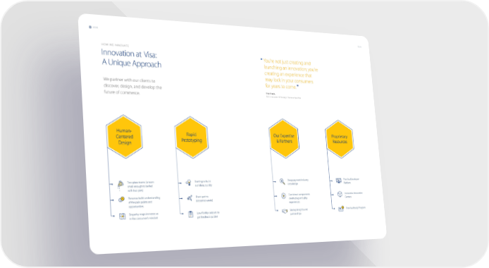 054 055 HOW WE INNOVATE Innovation at Visa: “ You’re not just creating and A Unique Approach launching an innovation; you’re creating an experience that may lock in your consumers We partner with our clients to for years to come. ” discover, design, and develop the Shiv Singh, future of commerce. SVP, Innovation & Strategic Partnerships, Visa Two-pizza teams (a team Starting to build Deep payment industry The Visa Developer small enough to be fed out ideas, quickly knowledge Platform with two pies) Personas build understanding Short sprints Combined components Immersive Innovation of the pain points and (about six weeks) create plug-and-play Centers opportunities experiences Empathy maps immerse us Low-fidelity outputs to Startup insights and The Visa Ready Program in the consumer’s mindset get feedback quicker partnerships