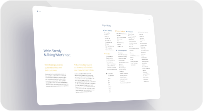 058 059 Capabilities Core Offerings Product Packages Ecosystem Value-Add Services Co-Brand Card Visa Checkout CyberSource Beacons/Sensors Fast Funds Credit Card Visa Direct Geolocation Services Card on File Debit Card Visa Commerce Network Mapping Services Aggregation Prepaid Card Visa Developer Data Visualizers Micropayment Corporate Card mVisa Messaging Platforms Points Private Label Card Visa Token Service Social Media Platforms Recurring Payments Gift Card Auth.Net Android OS Transaction Alerts Proximity Acceptance Verified by Visa Apple iOS Card Controls O2O Acceptance QR Code / Reader WeChat FX Rate Check Remote Acceptance Risk Management Messenger Real-Time Redemption We’re Already Line Digital Receipt Insights Tokenization Blockchain Instant Issue Cardholder Authenticate Internet of Things Amazon Loyalty Building What’s Next Pricing Analytics Real-Time Risk Scoring Data & Analytics Samsung Real-Time Offers AML & OFAC Checks Square Statement Credits Cardholder Analytics ID & Verification Retail Analytics Artificial Intelligence Transaction History Risk-Based Authentication Printed Text Reader Sourced Offers Performance Solutions Biometrics We’re helping our clients And we’re looking beyond Cardholder Retention Digital Wallet Card Link Risk Manager Account Updater build relationships with our doorstop to find what’s Cardholder Acquisition Threat Intelligence Cardholder Segmentation Location-Based Alerts their customers. next in payment technology. Decision Manager Cash Back Risk Replay ATM Locator The strength of those relationships depends on Our innovation starts with the best of Visa Payments Location Confirmation how well clients understand, and can anticipate, talent working in collaboration with clients at Account Attributes Enablement Takeover Protection Travel Notifier customer needs and behavior. So we’re building our Innovation Centers around the world—San Domain Controls new capabilities via the Visa Developer Platform Francisco, Miami, London, Dubai, Singapore, São Swipe Token Controls to transform contextual data—from payment Paulo, New York, Berlin, and Tel Aviv—but Dip Address Verification Stop Payment activity to life events—into predictive intelligence. we don’t stop there. We’re opening up the network Click Fraud Alerts Push Provision With this insight, clients can go beyond transactions via APIs and extending certification to new partners E-commerce Custom Rules to provide more relevant and frictionless experiences. all around the world through the Visa Ready Tap Program. And through Visa’s Everywhere Initiative Stream and Visa Ventures, we seek, partner and invest in Fund promising startups that are solving tomorrow’s Scan business challenges in innovative ways. Push