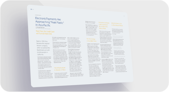 050 051 VIEWPOINTS ElectronicPayments Are information from the transaction, Consumers Are Ready What We Need to Do Approaching “Peak Plastic” including that 16-digit number. to Be Convinced, if to Move Beyond Plastic There’s a parallel here to mobile phone We Can Prove the numbers: How often do you look at the in Asia Pacific digits in someone’s mobile number? Value Is There All the right conditions are in place for It’s not visible anymore—you just card-free electronic payments to grow. By Christopher Boncimino tap on a name in your contact list. SVP, Innovation & Strategic Partnerships, Visa Taking into account the many ways in This will take time, but there are things And now with a few more taps you which payments are changing, what we can do as an industry to Next Year, the Credit Card can send that contact money, matters most is a seamless, intuitive and drive change: without needing to know anything ubiquitous customer experience. Our will Turn 60 Years Old. more than who they are. consumer research shows that the vast Continue to invest in future-proofing majority (over 80%) of consumers across our infrastructure and technology. But a card is just one physical form that card is dipped or tapped on a shop The Technology Asia Pacific are open to trying out new We can’t possibly anticipate what new payments can take in an increasingly terminal is the same one that can ways to pay, such as mobile phones, devices people might want to pay digital world. process an automated payment from Is Available Today wearables or other connected devices with in five or ten years’ time, but we Back in 1958, Visa Today, the industry is approaching peak an internet-connected refrigerator that (Visa/YouGov research). can keep developing standards and plastic. The technology, infrastructure, is programmed to order milk when it A greater number of seamless payment capabilities that can adapt to make became the original runs out. The only difference is that the But there are barriers holding them payments possible in any context. and consumer appetite are all at a point experiences in-store, online, and back from changing their behavior fintech company where payments can evolve beyond plastic card doesn’t necessarily need to in-app are being made available to be part of the transaction anymore. and embracing new forms of payment Maintain a relentless focus when we piloted the the physical card. consumers and businesses. Payments beyond cards. They’re often nervous on the customer experience. The important part that remains is are happening—today—via mobile about whether new technology is BankAmericard with What do we mean by peak plastic? the 16-digit card number. It’s this wallets, QR codes, chatbots, virtual secure, or they feel that the methods Ultimately, customers decide what 60,000 people in We’re not saying that cards are going 16-digit number that makes electronic assistants and IoT-connected devices. they use to pay today are already payment methods succeed by voting away overnight. Anything that’s been transactions possible, not the plastic These new experiences aren’t everyday good enough. There’s a sense among with their feet (or thumbs or facial California. part of commerce for over half a century it’s printed on. But the card number life for everyone yet, but they are consumers that new payment recognition) for the best experience. is so embedded that there will be a long is evolving too; they are slipping into beginning to scale. The Visa Ready technology needs to be proven useful Over the past six decades, the plastic tail of cards still in use for quite some time. Program brings payments to this before they start using it. Don’t innovate just for innovation’s sake. card has become inextricably linked But we are saying that the conditions exist the background, as payments become automatic and invisible. Instead of broader range of devices and services Technology can do anything. But— with the very idea of electronic to support a mass adoption of electronic having to enter a 16-digit card number in a secure, convenient manner, so that It’s the responsibility of all of us in the crucially—that doesn’t mean it has to payments. Visa—and others in our payments that are no longer solely in an app or on a website, people payments can happen on just about payments industry to establish that do everything. It’s about identifying business—became known as “credit dependent on plastic. can use their thumb to authenticate any form factor. utility by ensuring that the payment where technology adds value and card companies.” However, Visa has payments from their mobile phone. experiences beyond plastic are adding moves an experience forward. never defined itself that way. To us, Over time, the proportion of payments value and solving pain points in it’s never been the physical card that Consumers can store their card details that don’t involve a plastic card on file with the merchants they ways the physical card cannot, such At Visa, our role is to create the right actually matters. The Infrastructure compared to those that do will as integrating loyalty programs into conditions for our bank and merchant repeatedly shop with or subscribe to, continue to increase. We’re seeing Fundamentally, Visa is a payments Is Already in Place eliminating the need to enter their mobile shopping experiences or using partners to deliver innovation to their examples of digital issuance: Where a contextual information like location or customers, for any payment form factor. network that connects people or information each time they transact. consumer can apply for a card and be businesses who want to pay and those spending habits to provide targeted We’re excited to enable the future of The electronic payments ecosystem Tokenization makes these invisible issued digital credentials, including their offers, for instance. commerce and payments beyond cards. wh