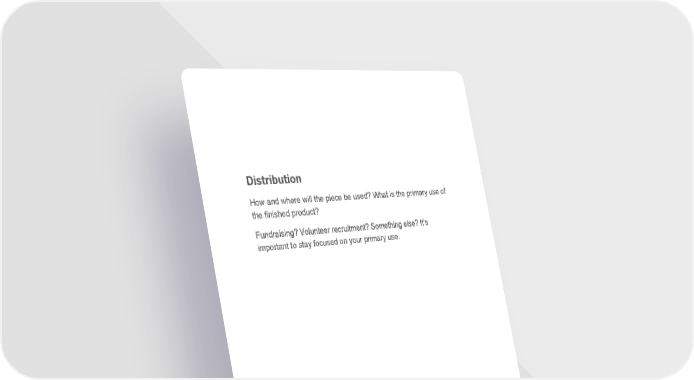 Distribution How and where will the piece be used? What is the primary use of the finished product? Fundraising? Volunteer recruitment? Something else? It’s important to stay focused on your primary use.