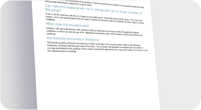 Who is eligible for this insurance? · You must be actively working (performing all normal duties of your job) at least 30 hours per week and be under age 80 · Your dependent(s) must be performing normal activities and not be confined (at home or in a hospital / care facility) and any child(ren) must be under age 26 What is the “Express Benefit”? This benefit is payable upon notification of an accident in which an insured person is injured. It can be paid in a short time frame with minimal information (compared to a typical claim). Can I take this insurance with me if I change jobs / am no longer a member of this group? In the event this insurance ends due to a change in your employment / membership status with the group, or for certain other reasons, you or your insured spouse have the right to continue this insurance under the Portability provision, subject to certain conditions. When does this insurance end? Insurance will end on the last day of the month in which an insured person no longer satisfies the applicable eligibility conditions, or when you reach the age of 80. Additional circumstances under which insurance will end are described in the certificate. Are there any exclusions or limitations? The benefits payable are based on the insurance in effect on the date of the covered accident, subject to the definitions, limitations, exclusions and other provisions of the policy. The exclusions and limitations are summarized in the outline of coverage and detailed in the certificate. Please contact your benefits administrator for a copy of the outline of coverage or if you have questions prior to enrolling. This information describes some of the features of the benefits plan. Benefits may not be available in all states. Please refer to the certificate booklet for a full explanation of the plan's benefits, exclusions, limitations and reductions. Should there be any discrepancy between the certificate booklet and this summary, the certificate booklet will prevail. Availability of benefits is subject to final acceptance and approval of the group application by the underwriting company. Accident insurance is underwritten by United of Omaha Life Insurance Company, 3300 Mutual of Omaha Plaza, Omaha, NE 68175, 1-800-769-7159. United of Omaha Life Insurance Company is licensed nationwide, except in New York. Policy form number 7000GM-U-EZ 2010. This policy provides accident insurance only. It does not provide basic hospital, basic medical or major medical insurance. It is not a Medicare supplement policy. The insurance is designed to pay you a fixed dollar amount regardless of the amount any provider charges. VOLUNTARY ACCIDENT INSURANCE