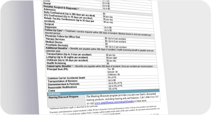 BENEFITS AMOUNTS 1 Initial Care & Emergency – Most treatment / service required within 72 hours of accident; Once per accident per insured person Emergency Room $0 Urgent Care Center $0 Initial Physician Office Visit $0 Ambulance Up to $0 Specified Injuries1,2 Fractures (Surgical / Non-surgical) Up to $0 Dislocations (Surgical / Non-surgical) Up to $0 Lacerations Up to $0 Burns Up to $0 Dental Up to $0 Hospital, Surgical & Diagnostic1,3 Admission $0 Daily Confinement (Up to 365 days per accident) $0 per day ICU Confinement (Up to 15 days per accident) $0 per day Rehab. Facility Confinement (Up to 30 days per $0 per day accident) Surgical Up to $0 Diagnostic Up to $0 Follow-Up Care1 – Treatment / service required within 365 days of accident; Medical device is once per accident per insured person Physician Follow-Up Office Visit $0; Up to 6 per accident Therapy Services $0; Up to 6 per accident Medical Device $0 Prosthetic Device(s) $0; Up to 2 per accident 1 Additional Benefits – Benefits are payable within 365 days of accident; Health screening benefit is payable once per calendar year Transportation (Up to 3 trips per accident) $0 per trip Lodging (Up to 30 nights per accident) $0 per night Childcare (Up to 30 days per accident) $0 per day Health Screening $0 Catastrophic Benefits1,4 – Benefits are payable within 365 days of accident; Once per accident per insured person Principal Sum (PS) You: $0 Spouse: $0 Child(ren): $0 Common Carrier Accidental Death 0% of PS Transportation of Remains Up to $0 Dismemberment & Paralysis Up to 0% of PS Reasonable Modifications Up to 0% of PS Coma 0% of PS SERVICES Hearing Discount Program The Hearing Discount program provides you and your family discounted hearing products, including hearing aids and batteries. Call 1-888-534-1747 or visit www.amplifonusa.com/mutualofomaha to learn more. 1Additional limitations apply as described in the certificate. 2Fractures and dislocations require treatment within 90 days of accident, burns and lacerations within 72 hours of an accident, and dental care within 30 days. If an insured person sustains both a fracture and dislocation as the result of the same accident, the maximum amount payable is up to 200% of the amount payable for the injury with the highest applicable benefit amount. 3Daily confinement must begin with 90 days of accident and ICU confinement within 30 days. Surgical treatment timeframes vary. If applicable, diagnostic services must be received within 90 days of accident. Except for confinement benefits, most benefits are payable once per accident per insured person. If any surgery occurs concurrently with an open reduction for a fracture or dislocation of the same bone or joint as a result of the same accident, only the highest applicable benefit is payable. 4The principal sum for you and your spouse reduces by 50% when you reach the age of 70.