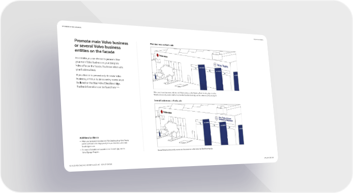 EXTERIORS AT DEALERSHIPS BACK TO CONTENTS Promote main Volvo business Main business on the facade or several Volvo business entities on the facade As a dealer you can choose to present either your main Volvo business or your complete Volvo offer on the facade. You know what suits your business best. If you choose to present only the main Volvo business, all Volvo business entity names must be listed on the blue Volvo Directional sign. Further information can be found here >> When you choose to present only the main Volvo business on the Volvo Iron Mark lettering sign, the other Volvo business entity names shall be listed on the blue directional sign and the entrance pylon, see page X. Several businesses on the facade Additional guidance • When you represent more than one Volvo business (e.g. Volvo Trucks and Volvo Construction Equipment), it is your decision which main facade sign to use. • For more information and available sizes for each sign, see the Volvo Signage Program. Several Volvo business entity names may be presented on the Volvo Iron Mark lettering sign. VOLVO EXPERIENCE AND IDENTITY GUIDELINE – DEALER EDITION JANUARY 2022 80