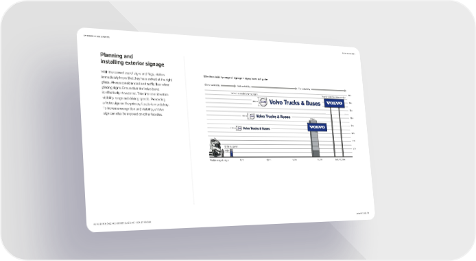 EXTERIORS AT DEALERSHIPS BACK TO CONTENTS Planning and installing exterior signage With the correct use of signs and flags, visitors Effective visibility range of signage – sign placement guide immediately know that they have arrived at the right place. Always consider road and traffic flow when Close readability Mid readability Far readability placing signs. Ensure that the Volvo brand 16m Volvo iron mark lettering signs Double-sided far distance sign is effectively showcased. Take into consideration 14m visibility range and driving speeds. Presenting 2400 mm VVolvo Tolvo Trucks & Busesrucks & Buses VlVolvo TkTrucks & BBuses a Volvo sign on the primary facade is mandatory. 12m To increase recognition and visibility, a Volvo 1600 mm VVolvo Tolvo Trucks & Busesrucks & Buses 10m sign can also be exposed on other facades. VlVolvo TkTrucks &B& Buses Pylon 8m 1200 mm VVolvo Tolvo Trucks & Busesrucks & Buses VlVolvo TkTrucks &&B Buses 6m 4m Entrance pylon 2m 10m 20m 50m 100m 5001000m Visible range to sign VOLVO EXPERIENCE AND IDENTITY GUIDELINE – DEALER EDITION JANUARY 2022 79