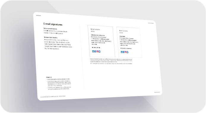 STATIONERY BACK TO CONTENTS E-mail signatures Name Surname Name Surname Volvo-owned dealers Job title Job title E-mails sent to Volvo cust omers should contain a Volvo e-mail signature. Volvo business entity name Volvo Penta Department | Main deartment Department | Main deartment Independent dealers T. +46 123 45 67 | Additional number T. +46 123 45 67 | Additional number Independent dealers must use their own Street address | City, State, Zip | Country Street address | City, State, Zip | Country e-mail signatures. They should not use the name.surname@volvo.com name.surname@volvopenta.com Volvo Spread Word Mark or the Volvo Penta volvo.com volvopenta.com Spread Word Mark or write “authorized dealer for...” in their signatures. Optional online point of interaction, such as official media accounts, can be added below the logotype (respecting the clear zone), either as icons like in the illustrations or url links. It is allowed to add up to four business driven and brand compliant e.g, SoMe links, badges etc. with icons. Maximum size of each icon is 24 pt. NOTE: Nothing else may be added (no icons, logos, banners, images etc., neither external, personal nor internal material). Checklist • Do not include taglines, marketing messages or quotes. • Do not include images, graphic elements or animations. Such elements will increase e-mail size. Images may also be blocked by anti-virus software, rendering an empty box with a red X in the e-mail message. • If including social media icons, only use official logotypes for respective media to respect the individual brands. VOLVO EXPERIENCE AND IDENTITY GUIDELINE – DEALER EDITION JANUARY 20221 64