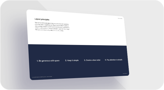 BACK TO CONTENTS Layout principles There are four defined principles to help convey the values and aspirations of the Volvo brand in graphic layouts. The principles are there to guide you when updating, designing or creating new marketing assets, presentations, services or other interfaces. The layout principles support the Volvo Design Philosophy where functionality, clarity and ease-of-use is key. 1. Be generous with space 2. Keep it simple 3. Create a clear order 4. Pay attention to details VOLVO EXPERIENCE AND IDENTITY GUIDELINE – DEALER EDITION JANUARY 2022 30