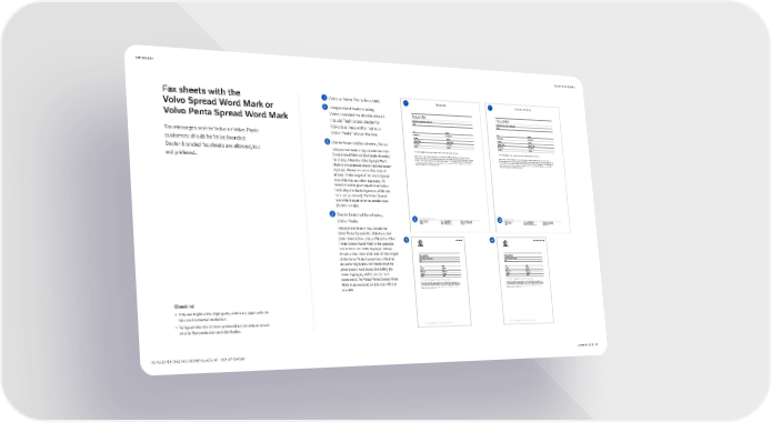 STATIONERY BACK TO CONTENTS Fax sheets with the 1 Volvo or Volvo Penta fax sheet. 1 1 Volvo Spread Word Mark or 2 Independent dealers using Volvo-branded fax sheets should T T Number of pages (incl. this page): Number of pages (incl. this page): Volvo Penta Spread Word Mark include “authorized dealer for Date: Date: Volvo business entity name or To: From: To: From: Volvo Penta” above the line. Company Company Company Company Fax messages sent to Volvo or Volvo Penta Name Name Name Name Department Department Department Department customers should be Volvo-branded. 3 Dealer-branded fax sheets, Volvo. Telephone Telephone Telephone Telephone Telefax Telefax Telefax Telefax Dealer-branded fax sheets are allowed, but Independent dealers may include the Volvo In case of illegible or missing pages, please notify sender immediately. Than you In case of illegible or missing pages, please notify sender immediately. Than you Please note: The information contained in this facsimile message is priileged and confidential and is Please note: The information contained in this facsimile message is priileged and confidential and is Spread Word Mark on their dealer-branded intended only for the use of the indiidual named aboe. If the recipient is not the intended recipient, you are intended only for the use of the indiidual named aboe. If the recipient is not the intended recipient, you are not preferred. hereby notified that any dissemination, distribution or copying of this communication is strictly prohibited. If hereby notified that any dissemination, distribution or copying of this communication is strictly prohibited. If fax sheets. Place the Volvo Spread Word you hae receied this communication in error, please notify us immediately by telephone and return the you hae receied this communication in error, please notify us immediately by telephone and return the original message to us ia the postal serice. original message to us ia the postal serice. Mark in the opposite corner from the dealer logotype. Always ensure a clear zone of at least 3X the height of the Volvo Spread Word Mark to any other logotypes. All brands must be given equal visual status (excluding the dealer logotype, which can be more prominent). The Volvo Spread Word Mark must never be smaller than 20 mm in width. 4 Dealer-branded fax sheets, 2 Authorized dealer for Volvo business entity name 2 Authorized dealer for Volvo Penta Dealer Company name Telephone ƒ„„ „„ „„ „„ „„ ‡egistered City, €tate, Country Dealer Company name Telephone ƒ„„ „„ „„ „„ „„ ‡egistered City, €tate, Country Volvo Penta. City, €tate, ‚ip code …obile ƒ„„ „„ „„ „„ „„ ‡egistration No. „„„„„„-„„„„ City, €tate, ‚ip code …obile ƒ„„ „„ „„ „„ „„ ‡egistration No. „„„„„„-„„„„ Country firstname.lastname†olo.com olo.com Country firstname.lastname†olopenta.com olopenta.com Independent dealers may include the Volvo Penta Spread Word Mark on their dealer-branded fax sheets. Place the Volvo 3 4 Penta Spread Word Mark in the opposite corner from the dealer logotype. Always ensure a clear zone of at least 4X the height T T of the Volvo Penta Spread Word Mark to Number of pages (incl. this page): Number of pages (incl. this page): Date: Date: any other logotypes. All brands must be To: From: To: From: given equal visual status (excluding the Company Company Company Company Name Name Name Name Department Department Department Department dealer logotype, which can be more Telephone Telephone Telephone Telephone prominent). The Volvo Penta Spread Word Telefax Telefax Telefax Telefax In case of illegible or missing pages, please notify sender immediately. Than you In case of illegible or missing pages, please notify sender immediately. Than you Please note: The information contained in this facsimile message is priileged and confidential and is Please note: The information contained in this facsimile message is priileged and confidential and is Mark must never be smaller than 45 mm intended only for the use of the indiidual named aboe. If the recipient is not the intended recipient, you are intended only for the use of the indiidual named aboe. If the recipient is not the intended recipient, you are hereby notified that any dissemination, distribution or copying of this communication is strictly prohibited. If hereby notified that any dissemination, distribution or copying of this communication is strictly prohibited. If you hae receied this communication in error, please notify us immediately by telephone and return the you hae receied this communication in error, please notify us immediately by telephone and return the in width. original message to us ia the postal serice. original message to us ia the postal serice. Checklist • Only use bright white, high quality stationery paper with the best environmental credentials. • Safeguard that the invoices produced are properly approved Postal Adress 123 Any Street Anytown, Postcode Country. Tel: 000 0000 000. www.webaddress.com Postal Adress 123 Any Street Anytown, Postcode Country. Tel: 000 0000 000. www.webaddress.com prior to final production and distribution. VOLVO EXPERIENCE AND IDENTITY GUIDELINE – DEALER EDITION JANUARY 2022 61