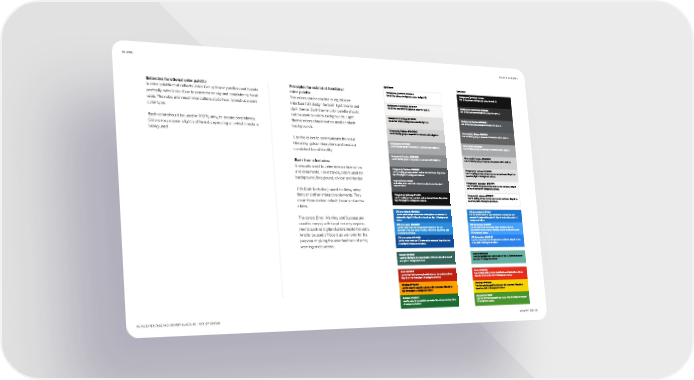 COLORS BACK TO CONTENTS Extended functional color palette Principles for extended functional For light theme For r theme A color palette that reflects Volvo Group brand position and blends color palette perfectly with Volvo Blue to create harmony and consistency for all The colors can be applied to digital user Backgroud / primary HEX #FFFFFF Backgroud / primary HEX #1™1™1™ uses. The rules and recommendations state how to best use each interface (UI) design for both light theme and color type. dark theme. Dark theme color palette should not be used on white backgrounds. Light Backgroud / secondary HEX #F2F2F2 Backgroud / secondary HEX #©‚©‚©‚ Each color should be used in 100% only, to secure consistency. theme colors should not be used on black Backgroud / tertiary Backgroud / tertiary HEX #±©±6±A Colors may appear slightly different depending on which media is backgrounds. HEX #E1~F~~ being used. Use the colors to communicate the visual Ornamental / divider HEX #~š~š~š Ornamental / divider HEX #6©6©6© hierarchy, guide interactions and create a ale consistent brand identity. c Ornamental / Rain HEX #A2AAŸ Ornamental / Rain HEX #A2AAŸ ays Gr Each theme includes: Grayscale: used to determine surface colors Ornamental / border HEX #B~ Ornamental / border HEX #~š~š~š and ornaments. For instance, colors used for background, foreground, divider and border. Foreground / tertiary HEX #±©±6±A Foreground / tertiary HEX #E1~F~~ CTA (Call-To-Action): use it for links, selec- Foreground / secondary HEX #©‚©‚©‚ Foreground / secondary HEX #F2F2F2 tions and other interactive elements. They cover three states: default, hover and active Foreground / primary HEX #1™1™1™ Foreground / primary HEX #FFFFFF states. The colors Error, Warning and Success are CTA blue / default HEX #1C6BBA CTA blue / default HEX #1F2~1 used to comply with legal industry require- ments such as digital clusters inside the cabs. CTA blue / qover HEX #‚BE~E CTA blue / qover HEX #™™A1FF And to be used off board as well only for the purpose of giving the user feedback of error, CTA blue / active HEX #1š™EŸB CTA blue / active HEX #‚C©EF warning and success. Accent HEX #©™6±±Ÿ Accent HEX #66B©A6 Error HEX #BF‚š1‚ Error HEX #EA‚C1A Warning HEX #FFAššš Warning HEX #F2~©š‚ Success HEX #1A6C©1 Success HEX #™2Ÿ6‚~ VOLVO EXPERIENCE AND IDENTITY GUIDELINE – DEALER EDITION JANUARY 2022 24