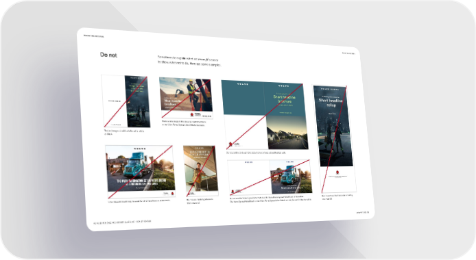 MARKETING MATERIAL BACK TO CONTENTS Do not Sometimes to explain what we mean, it’s easier to show what not to do. Here are some examples. Sub-heading aboSub-heading abovve the headline e the headline Longer headline Longer headline brocbrochure shure set et Sub-heading above the headline on three lineson three lines Short headline Sub-heading above the headline Short headline Suheading aove the headline brochure rollup Short headline Sub-heading below the headline brochure Volvo Construction Equipment. Building Tomorrow Volvo Buses. Driving quality of life Made to move you Local dealer address. Tel. +00 0 0000 0000. www.localdealerweb.xx Authorized dealer for Volvo Penta Make sure to respect the Volvo Spread Word Mark Local dealer or the Volvo Penta Spread Word Mark clear zone. Local dealer address. Tel. +00 0 0000 0000 www.localdealerweb.xx Made tMade to moo movve ye youou Text on images should only be set in white or black. Local dealer address Tel. +00 0 0000 0000 www.localdealerweb.xx Authorized dealer for business entity name HEADLINE SET IN Do not combine and use Volvo accent colors in large colored backgrounds. DEALER TYPEFACE Sub-heading set in dealer typeface Local dealer address. Tel. +00 0 0000 0000 www.localdealerweb.xx Too much information set in Volvo Broad Authorized dealer for Volvo Penta as a headline on two lines Volvo Trucks. Driving Progress Sub-heading above the headline Business entity set in dealer typeface Short headline brochure Local dealer address. Local dealer address Tel. +00 0 0000 0000. Tel. +00 0 0000 0000 Local dealer address www.localdealerweb.xx www.localdealerweb.xx Tel. +00 0 0000 0000 www.localdealerweb.xx Authorized dealer for business entity name Authorized dealer for Volvo business entity name Authorized dealer for Volvo business entity name Volvo Trucks. Driving Progress Volvo Broad should only be used for short headlines or statements. Do not use dealer typefaces in Do not use the Volvo Spread Word Mark or the Volvo Penta Spread Word Mark in Volvo Blue. Do not use the white frame when creating Volvo material. The Volvo Spread Word Mark or the Volvo Penta Spread Word Mark can only be used in black or white. new material. VOLVO EXPERIENCE AND IDENTITY GUIDELINE – DEALER EDITION JANUARY 2022 52