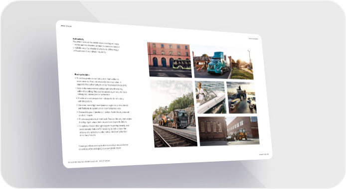 IMAGE TONALITY BACK TO CONTENTS Authenticity Pay attention to all the details when creating an image – make sure the depicted product is placed and used in a realistic way. A professional who looks at the image will spot even the smallest irregularity. Basic principles • Show the products hard at work in their authentic environments. Products should be clean but when it supports the authenticity, it is okay for products to be dirty. • Include human presence with people who fit naturally within the setting. They can be operators, drivers, worksite colleagues, passengers or bystanders. • Provide a broad perspective – always try to tell a story with the picture. • Use clear, warm light and dynamic angles to portray details and features in a premium and contemporary way. • Choose images of products in action. Avoid closely cropped product images. • Showcase products at their best. Capture the very best angles that highlight unique features and brand-specific details. • Simplicity. Choose the right objects to portray visually, and avoid objects that aren’t interesting to look at. Look for simple, strong backgrounds that do not divert attention from the products. These guidelines are applicable for stock photo purchases as well as when arranging your own photo shoot. VOLVO EXPERIENCE AND IDENTITY GUIDELINE – DEALER EDITION JANUARY 20221 39