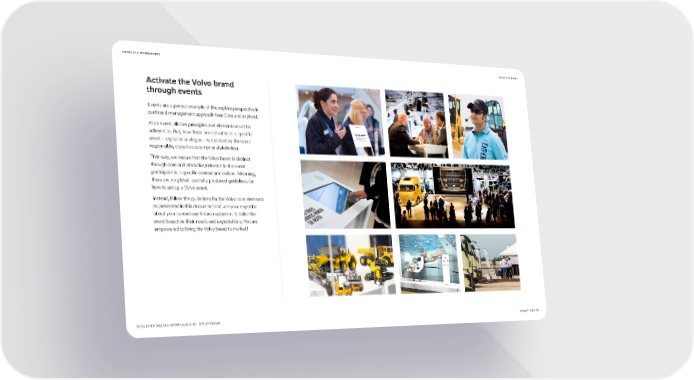 EVENTS AND SPONSORSHIPS BACK TO CONTENTS Activate the Volvo brand through events Events are a perfect example of the explore perspective in our brand management approach (see Core and explore). At an event, all core principles and elements must be adhered to. But, how these are activated at a specific event – digital or analogue – is decided by the event responsible, close to customer or stakeholder. That way, we secure that the Volvo brand is distinct through core and attractive/relevant to the event participant in a specific context and culture. Meaning, there are no global, centrally produced guidelines for how to set up a Volvo event. Instead, follow the guidelines for the Volvo core elements as presented in this document and use your expertise about your current and future customers to tailor the event based on their needs and expectations. You are empowered to bring the Volvo brand to market! VOLVO EXPERIENCE AND IDENTITY GUIDELINE – DEALER EDITION JANUARY 20221 69