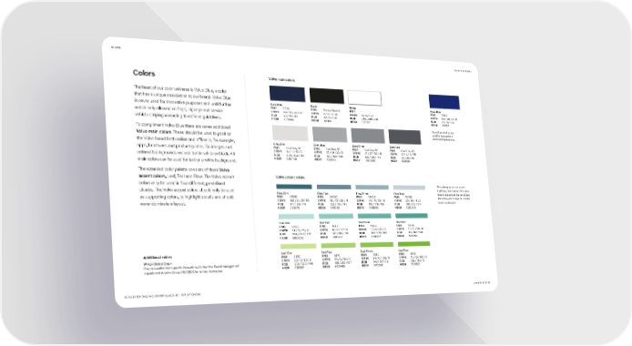 COLORS BACK TO CONTENTS Colors Volvo main colors The heart of our color universe is Volvo Blue, a color that has a unique association to our brand. Volvo Blue is never used for decorative purposes and until further Dark Blue Black White Volvo Blue 2747C 533C Process Black C - PMS PMS PMS PMS notice only allowed on flags, signage and service CMYK 88 / 72 / 32 / 72 CMYK 0 / 0 / 0 / 98 CMYK 0 / 0 / 0 / 0 CMYK 100 / 85 / 0 / 15 RGB 32 / 42 / 68 RGB 20 / 20 / 20 RGB 255 / 255 / 255 RGB 24 / 40 / 113 vehicle striping according to defined guidelines. HEX# 202A44 HEX# 141414 HEX# FFFFFF HEX# 182871 To compliment Volvo Blue there are seven additional Volvo Blue shall not be used for decorative or Volvo main colors. These should be used to position accentuating purposes. the Volvo brand both online and offline in, for example, Grey One Grey Two Grey Three Grey Four PMS Cool Grey 1C PMS Cool Grey 5C PMS Cool Grey 8C Cool Grey 11C apps, brochures and product guides. On images and PMS CMYK 14 / 11 / 13 / 0 CMYK 37 / 29 / 30 / 8 47 / 37 / 38 / 18 22 / 0 / 0 / 85 CMYK CMYK colored backgrounds we use text in white or black. All RGB 225 / 223 / 221 RGB 167 / 168 / 169 RGB 136 / 139 / 141 RGB 83 / 86 / 90 main colors can be used for text on a white background. HEX# E1DFDD HEX# A7A8A9 HEX# 888B8D HEX# 53565A The extended color palette consists of three Volvo accent colors, Leaf, Teal and Flow. The Volvo accent Volvo accent colors colors may be used in four different, predefined The primary accent colors are shades. The Volvo accent colors should only be used Leaf One, Teal One and Flow One. Flow One Flow Two Flow Three Flow Four Note that Leaf and Teal are lighter as supporting colors, to highlight details and should PMS 3155C PMS 5483C PMS 5493C PMS 5513C than Flow, which impacts shading never dominate a layout. CMYK 100 / 0 / 25 / 50 CMYK 68 / 25 / 30 / 15 CMYK 45 / 15 / 25 / 10 CMYK 30 / 10 / 18 / 2 scale visualization. RGB 57 / 105 / 118 RGB 103 / 140 / 150 RGB 150 / 176 / 182 RGB 195 / 210 / 214 HEX# 396976 HEX# 678C96 HEX# 96B0B6 HEX# C3D2D6 Teal One Teal Two Teal Three Teal Four 564C 563C 7473C PMS 573C PMS PMS PMS CMYK 24 / 0 / 15 / 0 CMYK 40 / 0 / 27 / 0 CMYK 55 / 0 / 35 / 0 CMYK 75 / 15 / 50 / 0 RGB 184 / 222 / 216 RGB 141 / 201 / 191 RGB 102 / 179 / 166 RGB 80 / 162 / 148 HEX# B8DeD8 HEX# 8DC9BF HEX# 66B3A6 HEX# 50A294 Additional colors Leaf One Leaf Two Leaf Three Leaf Four 365C 367C PMS 368C PMS 369C PMS PMS Winter Orchid Green CMYK 30 / 0 / 60 / 0 CMYK 40 / 0 / 68 / 0 CMYK 59 / 0 / 100 / 0 CMYK 70 / 10 / 100 / 0 May be used for Volvo specific innovations. Contact the Brand management RGB 200 / 230 / 145 RGB 168 / 212 / 107 RGB 143 / 197 / 78 RGB 120 / 184 / 51 department at Volvo Group HQ (BEX) HEX# C8E691 HEX# A8D46B HEX# 8FC54E HEX# 78B833 for further information. VOLVO EXPERIENCE AND IDENTITY GUIDELINE – DEALER EDITION JANUARY 2022 21