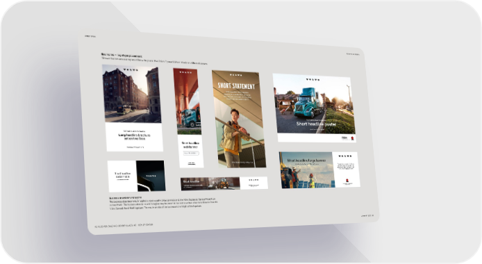 LOGOTYPES BACK TO CONTENTS Examples – logotype placement Shown below are examples of how to place the Volvo Spread Word Mark on different assets. Short Statement Lorem ipsum dolor amet consectetur adipiscing elit ut ed doe officim porerum et inctur rero mod quidi nosam, nobis dis eveles voluptium assimpo rporporeptas sit. Sub-heading above the headline Short headline poster Volvo Trucks. Driving Progress Sub-heading above the headline Local dealer address Long headline brochure Tel. +00 0 0000 0000 www.localdealerweb.xx set on two lines Authorized dealer for Volvo business entity name Short headline Volvo Buses. Driving quality of life web banner CALL TO ACTION Volvo Buses. Driving quality of life Short headline large banner Volvo Trucks. Driving progress Volvo Construction Equipment. Building Tomorrow Fugiapa et sum ui aeceatur luptamius doluptat ali quiae latet as. Molori tas doloria tuo ex lande eta luptamius dolu tium sum velit pa aeceatur etum. Short headline social media Sub-heading below the headline Short headline Lorem ipsum dolor amet consectetur adipis Volvo Construction Equipment. Local dealer address. Tel. +00 0 0000 0000 CALL TO ACTION Building Tomorrow www.localdealerweb.xx Authorized dealer for Volvo business entity name Business descriptor and tagline The business descriptor and/or tagline is never used in direct connection to the Volvo logotypes (Spread Word Mark or Iron Mark). The business descriptor and/or tagline may be presented as text on at least clear zone distance from the Volvo Spread Word Mark logotype. The maximum size of the text equals the height of the logotype. VOLVO EXPERIENCE AND IDENTITY GUIDELINE – DEALER EDITION JANUARY 2022 10