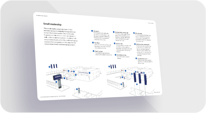 EXTERIORS AT DEALERSHIPS BACK TO CONTENTS Small dealership This example displays proper placement of Volvo 1 Volvo pylon 4 Volvo Iron Mark lettering sign 7 Entrance pylons and dealer signage at a dealership that represents one The most prominent identification The Volvo Iron Mark lettering sign is The entrance pylon, with the illuminated or more Volvo business entities (Volvo Construction for the Volvo brand is used to mark placed on the opposite side of your Volvo Iron Mark and the Volvo Penta Equipment and Volvo Penta is used as an example) as the entrance gate to the dealership. dealership name sign (alternatively entrance pylon should preferably be The name of the Volvo business is a Volvo wall sign may be used). placed in front of the main entrance to well as other complementary brands. It is allowed to list presented on the sub-sign. Respect clear zones. the reception area. complementary brands on the Volvo multi-brand signage, or present them on separate non-Volvo signs from the 2 Volvo flags 5 Volvo wall sign 8 Multi-brand main exterior pylon complementary brand’s dedicated signage program. One or two sets of banner flags, with The Volvo wall sign is placed on the Complementary brands, such as tires three flags in each set, enhance the opposite side of your dealership and oil makers, may be listed below Volvo identity on the site. name sign. The business entity name the Volvo Word Mark logotype on can bepresented on the sub-sign the silver-colored multi-brand main 3 Dealer logotype (optional). exterior pylon. Your dealership name Your dealership sign/logotype is or logotype may appear at the top placed on the facade by the entrance. 6 Volvo Penta wall sign of this sign. Volvo Penta needs a separate wall sign. 9 Complementary brands Present complementary brands on separate signs, clearly separated from the Volvo signs. 2 2 3 6 3 4 6 5 9 9 7 7 1 8 2 8 VOLVO EXPERIENCE AND IDENTITY GUIDELINE – DEALER EDITION JANUARY 2022 88