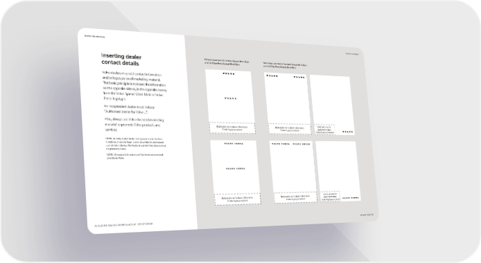 MARKETING MATERIAL BACK TO CONTENTS Inserting dealer Primary placement of the Volvo Spread Word Mark Secondary placement of the Volvo Spread Word Mark and the Volvo Penta Spread Word Mark and the Volvo Penta Spread Word Mark contact details Volvo dealers may add contact information and/or logotype on all marketing material. The basic principle is to insert the information on the opposite side or, in the opposite corner, from the Volvo Spread Word Mark or Volvo Penta logotype. An independent dealer must include “Authorized dealer for Volvo ...”. Also, always use Volvo-branded marketing material to promote Volvo products and Dedicated area for dealer information. Dedicated area for dealer information. Dedicated area for Dealer logotype optional Dealer logotype optional dealer information. services. Dealer logotype optional NOTE: An independent dealer that represents only the Volvo brand may choose to forgo its own visual identity and instead use the Volvo identity. Permission to use the Volvo identity must be granted by Volvo. NOTE: All product information and fact sheets are produced centrally by Volvo. Dedicated area for dealer information. Dedicated area for dealer information. Dedicated area for Dealer logotype optional Dealer logotype optional dealer information. Dealer logotype optional VOLVO EXPERIENCE AND IDENTITY GUIDELINE – DEALER EDITION JANUARY 20221 46