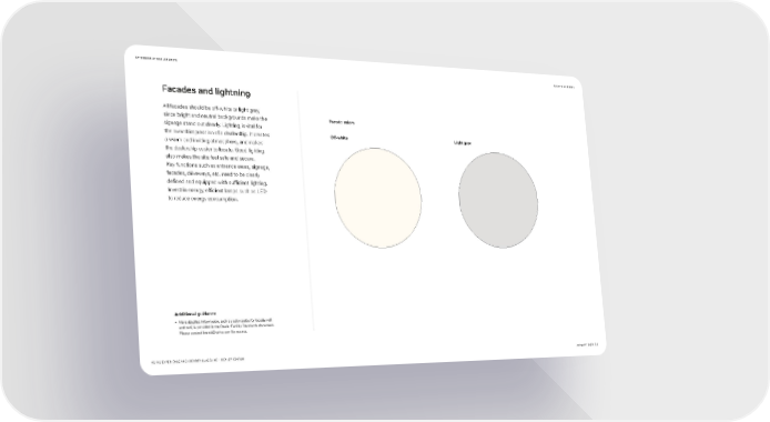 EXTERIORS AT DEALERSHIPS BACK TO CONTENTS Facades and lightning All facades should be off-white or light grey, since bright and neutral backgrounds make the Facade colors signage stand out clearly. Lighting is vital for the overall impression of a dealership. It creates Off-white Light grey a warm and inviting atmosphere, and makes the dealership easier to locate. Good lighting also makes the site feel safe and secure. Key functions such as entrance areas, signage, facades, driveways, etc. need to be clearly defined and equipped with sufficient lighting. Invest in energy-efficient lamps such as LED to reduce energy consumption. Additional guidance • More detailed information, such as color codes for facade wall and roof, is provided in the Dealer Facility Standards document. Please contact brand@volvo.com for access. VOLVO EXPERIENCE AND IDENTITY GUIDELINE – DEALER EDITION JANUARY 20221 85