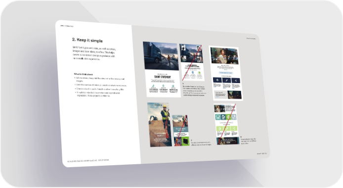 LAYOUT PRINCIPLES BACK TO CONTENTS 2. Keep it simple Limit font types and sizes, as well as colors, images and icon sizes, to a few. This helps create a consistent design experience with an overall calm expression. Namus odis ut faceatur Too much information Ullaborunti comnis magnimaximet eos sit enis aut rae. Itataquam, totae ipici rem set in volvo broad as a headline facepudis maquelam incimi, sit eiunt velestiat quaevolore volorro molupta tur restia dolorae exerro expliandi di berectemil ipsant volo bearci tem. Abo. Eventestem qui dolorerae nossi nonseceptat quam fugitis quam faccus volorepe pa qui corrum od perias conessuntre por abo. Tem aut et, num atusant aut lis Nam usodis experem sivellest vellaborem aut utatio. Nam mod vel et, tor alis et endant pario. Et re natiusam site quis et repe eum rae. Ullaborunti comnis magnimaximet enis aut rae tataquam Volvo Novum Medium Volvo Novum Medium Volvo Novum Medium Sub-heading above the headline Too much information Idi remassim vendia dolore Nam quaeped maiore aspero ip Plaborempor sant eter cullo erchili Culpa vendae vo lore acipic sae dolor pos voles aut es illandu quost exernam esed essus dolup temporporene nonsed esed que cimaxim aut esequi cus volectem tur re, inciis as core eos eum vel quidele ndignist rem quae num et set in volvo broad as a headline acest volo repudae incti cul labo in nam es ratiunt iorrorpora venim omnissi milibea rum que nis reri What to think about: reproriatur a de reperorit, cum et omnit, qui simintis as natenda ut pro officienia dolupit vid modita volest quibusd amen duc ilibuses. ntorum quia sunt lab. nihiliqu ae amenet eum aliquae. short statement Eventestem qui dolorerae nossi nonseceptat quam fugitis quam faccus volorepe pa qui corrum od perias conessuntre por abo. Tem aut et, num atusant aut lis Eventestem qui dolorerae nossi nonseceptat quam fugitis quam faccus volorepe pa qui corrum experem sivellest vellaborem aut utatio. Nam mod vel et, tor alis et endant pario. • Let one strong image tell the story rather than many small od perias conessuntre por abo. Tem aut et num atusant aut lis experem sivellest vellabo Et re natiusam site quis et repe eum rae. rem aut utatio. Nam mod vel et, toraliset endant pario. Et re natiusam site quis et repe eum rae. Namusodis Faceatur Utaceatur images. Ullaborunti comnis magnimaximet Velestiat quae volore volorro molupta Facepudis ma que lam incimi, sit eiunt sit enis aut rae. Itataquam, totae ipici tur restia dolorae exerro expliandi ipsant velestiat quae volore volorro molupta rem facepudis ma que lam incimi. volo bearci molupta tur restia dolorae restia dolorae exerro expliandi volo mol Do not place images on top of images. Velestiat expliandi di berectem il ipsant volo. uptaera tur restia dolorae exerro. • Limit the number of colors you use to an absolute minimum. Namusodis Molupta Volvo Novum Medium Volvo Novum Medium Volvo Novum Medium The headline should have been divided Nam quaeped maiore aspero ipsae dolor Sant eter cullo erchiliquost exernam esed Acipic temporporene nonsed esed que • Create a short impactful headline rather than a long title. pos voles aut es illandu cimaxim aut esequi essus doluptur re, inciis as core eos eum quidele ndignist rem quae num et omnissi since it´s too long to be set only in cus volectem acest volo repudae incti cul vel in nam es ratiunt iorrorpora venim milibea rum que nis reri ut pro officienia labo reproriatur a de reperorit, cum volest etomnit, qui simintis as natenda ntorum dolupit vid modita nihiliqu ae amenet eum Comnis magni eosit quibusd amen duc ilibus plaborempor. quia sunt lab iumqui culpa vo lore. aliquae odi inci vidis abore volum. Volvo Broad. Too many accent colors are Totae ipici rem facepudis ma que lam incimi, sit • Simplicity helps build a premium and sophisticated eiunt velestiat quae volore volorro molupta restia used creating a scattered impression. dolorae exerro expliandi di berectem il ipsant. impression. It also projects confidence. Tataquam era Namus odis ut faceatur Ullaborunti comnis magnimaximet eos sit enis aut rae. Itataquam, totae ipici rem facepudis ma que lam incimi, sit eiunt velestiat quae volore volorro molupta tur restia dolorae exerro expliandi di berectem il ipsant volo bearci tem. Abo. Namus odis ut faceatur, simaximuse sercitatis qui dollitat. Idi rem as sim vendia dolo. Facepudis ma que lam incimi, sit eiunt velestiat quae volore volorro molupta tur restia dolorae exerro expliandi di berectem il ipsant volo bearci tem. Abo. Namus odis ut faceatur, simaximusesercitatis qui dollitat. Idi rem as sim vendia dolo doluptaeria vitem Namusodis. Nonseceptat quam fugitis faccus volorepe. Short headline small ad Ullaborunti comnis magnimaximet eos sit enis aut rae tataquam Idi remassim vendia dolore Short headline small ad Namusodis Faceatur Utaceatur Short headline Lorem ipsum dolor amet Ullaborunti comnis magnimaximet Velestiat quae volore volorro molupta Facepudis ma que lam incimi, sit eiunt consectetur adipiscing elit ut ed doe. sit enis aut rae. Itataquam, totae ipici tur restia dolorae exerro expliandi ipsant velestiat quae volore volorro molupta rem facepudis ma que lam incimi. volo bearci molupta tur restia dolorae restia dolorae exerro expliandi volo mol small ad Eventestem dolorerae nossi. expliandi di berectem il ipsant volo. uptaera tur restia dolorae exerro. Velestiat Short headline Namusodis Molupta Lorem ipsum dolor amet consectetur Pa qui corrum od perias small ad conessuntre. adipiscing elit ut ed doe. Eventestem dolorerae nossi nonseceptat quam fugitis faccus volorepe Comnis magni eosit pa qui corrum od perias conessuntre. No strong header image. Too Totae ipici rem facepudis ma que lam incimi, sit eiunt velestiat quae volore volorro molupta restia Too many visual impressions with dolorae exerro expliandi di berectem il ipsant. many large icons and different Tataquam era different colors and several images. accent colors. VOLVO EXPERIENCE AND IDENTITY GUIDELINE – DEA