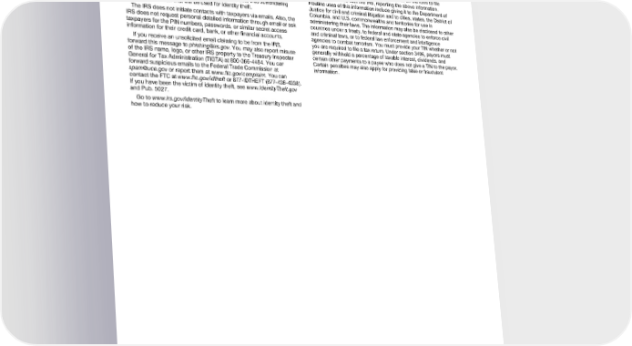 DocuSign Envelope ID: 2E20F7CF-153F-42FA-8827-9889FD2D2C28 Form W-9 (Rev. 3-2024) Page 6 Victims of identity theft who are experiencing economic harm or a Privacy Act Notice systemic problem, or are seeking help in resolving tax problems that have not been resolved through normal channels, may be eligible for Section 6109 of the Internal Revenue Code requires you to provide your Taxpayer Advocate Service (TAS) assistance. You can reach TAS by correct TIN to persons (including federal agencies) who are required to calling the TAS toll-free case intake line at 877-777-4778 or TTY/TDD file information returns with the IRS to report interest, dividends, or 800-829-4059. certain other income paid to you; mortgage interest you paid; the Protect yourself from suspicious emails or phishing schemes. acquisition or abandonment of secured property; the cancellation of Phishing is the creation and use of email and websites designed to debt; or contributions you made to an IRA, Archer MSA, or HSA. The mimic legitimate business emails and websites. The most common act person collecting this form uses the information on the form to file is sending an email to a user falsely claiming to be an established information returns with the IRS, reporting the above information. legitimate enterprise in an attempt to scam the user into surrendering Routine uses of this information include giving it to the Department of private information that will be used for identity theft. Justice for civil and criminal litigation and to cities, states, the District of Columbia, and U.S. commonwealths and territories for use in The IRS does not initiate contacts with taxpayers via emails. Also, the administering their laws. The information may also be disclosed to other IRS does not request personal detailed information through email or ask countries under a treaty, to federal and state agencies to enforce civil taxpayers for the PIN numbers, passwords, or similar secret access and criminal laws, or to federal law enforcement and intelligence information for their credit card, bank, or other financial accounts. agencies to combat terrorism. You must provide your TIN whether or not If you receive an unsolicited email claiming to be from the IRS, you are required to file a tax return. Under section 3406, payors must forward this message to [email protected]. You may also report misuse generally withhold a percentage of taxable interest, dividends, and of the IRS name, logo, or other IRS property to the Treasury Inspector certain other payments to a payee who does not give a TIN to the payor. General for Tax Administration (TIGTA) at 800-366-4484. You can Certain penalties may also apply for providing false or fraudulent forward suspicious emails to the Federal Trade Commission at information. [email protected] or report them at www.ftc.gov/complaint. You can contact the FTC at www.ftc.gov/idtheft or 877-IDTHEFT (877-438-4338). If you have been the victim of identity theft, see www.IdentityTheft.gov and Pub. 5027. Go to www.irs.gov/IdentityTheft to learn more about identity theft and how to reduce your risk.