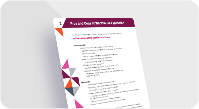 2 Pros and Cons of Warehouse Expansion By now you have a good idea of why you might want to invest in more warehouse space. Let’s evaluate some possible outcomes. Potential benefits •Ability to meet rising customer demand and expectations •Capacity to scale your business for an influx of orders or seasonal rushes •Lower shipping costs •Improved efficiencies and greater productivity across the board •More convenient location for vendors, logistics, staff •Competitive advantage for multi-channel endeavors •Freedom to add new product lines •Opportunities for reimagining tech infrastructure and workflow •Equity growth and appreciation in property you own •Potential to tie costs to volume and avoid large up front investments if partnering with a 3PL Potential risks •Increased labor, material, and operational costs •Large upfront capital investment unless choosing to expand through a 3PL relationship •Cost overruns and scheduling delays in construction •Lengthy process to build a new facility from scratch •Or, if buying or leasing existing warehouse real estate, lack of availability in key geographies and high purchase/rental costs •Mistakes due to lack of project management expertise •Unknowns of new location, labor force, logistics requirements Comparing the pros and cons above will give you a good gut feeling about the feasibility of adding warehouse space. Now follow up with quantitative analysis. You can easily run the numbers to predict your anticipated break-even point. Here’s how… Time to Expand Your Ecommerce Warehouse? A Guide from Extensiv 6