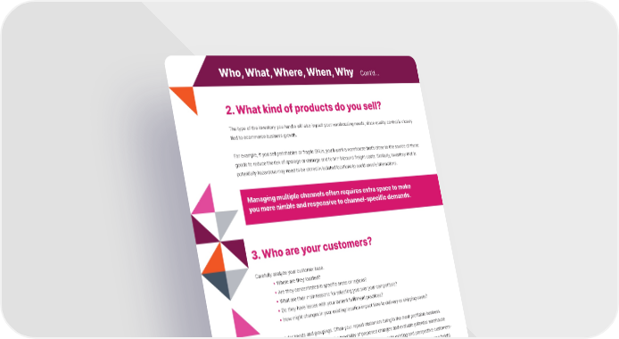 Who, What, Where, When, Why Cont’d... 2.What kind of products do you sell? The type of the inventory you handle will also impact your warehousing needs, since quality control is closely tied to ecommerce business growth. For example, if you sell perishables or fragile SKUs, you’ll want a warehouse that’s close to the source of those goods to reduce the risk of spoilage or damage and to trim inbound freight costs. Similarly, inventory that is potentially hazardous may need to be stored in isolated locations to avoid unsafe interactions. Managing multiple channels often requires extra space to make you more nimble and responsive to channel-specific demands. 3.Who are your customers? Carefully analyze your customer base. •Where are they located? •Are they concentrated in specific areas or regions? •What are their main reasons for selecting you over your competitors? •Do they have issues with your current fulfillment practices? •How might changes in your existing location impact time to delivery or shipping costs? Also check for trends and groupings. Often your repeat customers bring in the most profitable business. Knowing this could help you assess the feasibility of proposed changes and evaluate potential warehouse locations. The goal is to find sustainable locations that put you closer to existing and prospective customers– especially the ones responsible for the bulk of your business. Doing so can bring down handling and freight costs, as well as improve order fulfillment timeframes. If your repeat customers are happy with the status quo, carefully consider the changes you make. You can’t afford to alienate them–or, even worse, lose them if the expansion goes south or creates a worse experience for them. Identify locations that are convenient for your most essential customers. The best place might be where you already are. Time to Expand Your Ecommerce Warehouse? A Guide from Extensiv 4