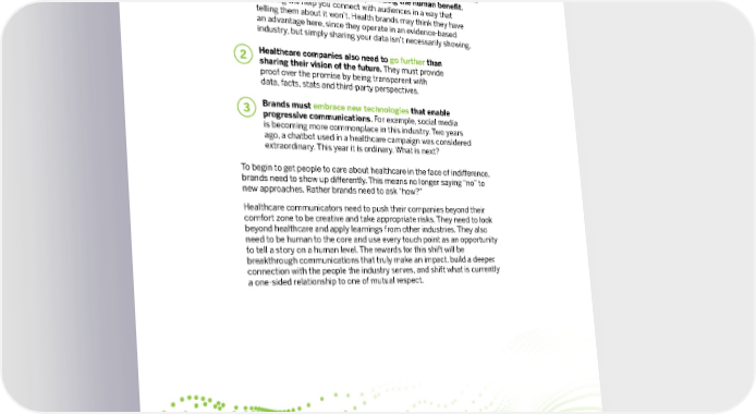 Healthcare brands need to show versus tell about their science, innovations and products, emphasizing the human benefit. Showing will help you connect with audiences in a way that telling them about it won’t. Health brands may think they have an advantage here, since they operate in an evidence-based industry, but simply sharing your data isn’t necessarily showing. Healthcare companies also need to go further than sharing their vision of the future. They must provide proof over the promise by being transparent with data, facts, stats and third-party perspectives. Brands must embrace new technologies that enable progressive communications. For example, social media is becoming more commonplace in this industry. Two years ago, a chatbot used in a healthcare campaign was considered extraordinary. This year it is ordinary. What is next? To begin to get people to care about healthcare in the face of indifference, brands need to show up differently. This means no longer saying “no” to new approaches. Rather brands need to ask “how?” Healthcare communicators need to push their companies beyond their comfort zone to be creative and take appropriate risks. They need to look beyond healthcare and apply learnings from other industries. They also need to be human to the core and use every touch point as an opportunity to tell a story on a human level. The rewards for this shift will be breakthrough communications that truly make an impact, build a deeper connection with the people the industry serves, and shift what is currently a one-sided relationship to one of mutual respect. 1 2 3 11