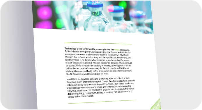 Technology’s entry into healthcare complicates the ethics discussion. Patient data is more plentiful and accessible than before. In Australia, for example, consumers are hesitant to opt-in to the country’s “My Health Record” due to fears about privacy and data protection. In Germany, the health system is far behind when it comes to electronic health records, in part because it is unclear who can access the data and where it should be stored. Unfortunately, the country is missing out on opportunities to deliver better care and save money. In the U.K., media and healthcare stakeholders reacted badly to the announcement that information from the NHS website would be available on Alexa. In addition, AI-powered solutions are raising fears about built-in bias. Providers worry that technology will disrupt the cherished patient-provider relationship and contribute to physician burn out. Tech-fueled healthcare innovations sometimes overpromise and underdeliver, reinforcing the view that healthcare can fall short of expectations. As a result, the ethical debate is gaining momentum, adding an entirely new set of issues and voices to the conversation. 5