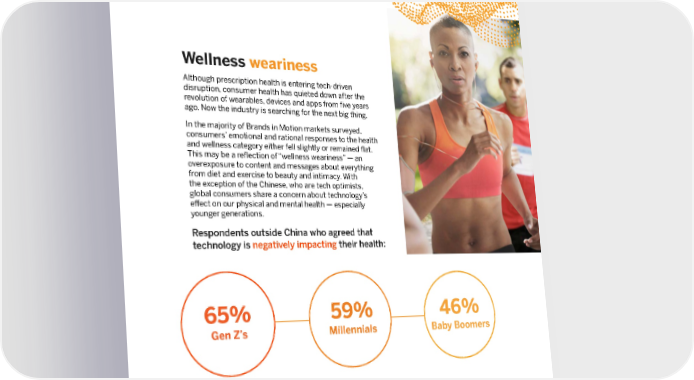 Wellness weariness Although prescription health is entering tech-driven disruption, consumer health has quieted down after the revolution of wearables, devices and apps from five years ago. Now the industry is searching for the next big thing. In the majority of Brands in Motion markets surveyed, consumers’ emotional and rational responses to the health and wellness category either fell slightly or remained flat. This may be a reflection of “wellness weariness” — an overexposure to content and messages about everything from diet and exercise to beauty and intimacy. With the exception of the Chinese, who are tech optimists, global consumers share a concern about technology’s effect on our physical and mental health — especially younger generations. Respondents outside China who agreed that technology is negatively impacting their health: Consumer health companies need to innovate now to regain their relevance, change younger consumers’ minds on tech and health, and stay ahead of consumer weariness. 46% Baby Boomers 59% Millennials 65% Gen Z’s 7