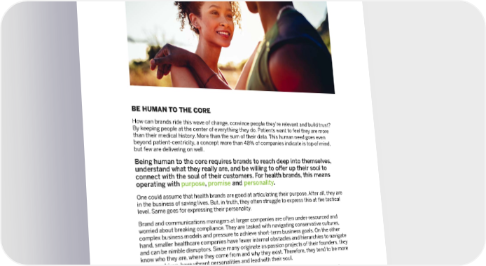 BE HUMAN TO THE CORE How can brands ride this wave of change, convince people they’re relevant and build trust? By keeping people at the center of everything they do. Patients want to feel they are more than their medical history. More than the sum of their data. This human need goes even beyond patient-centricity, a concept more than 48% of companies indicate is top of mind, but few are delivering on well. Being human to the core requires brands to reach deep into themselves, understand what they really are, and be willing to offer up their soul to connect with the soul of their customers. For health brands, this means operating with purpose , promise and personality . One could assume that health brands are good at articulating their purpose. After all, they are in the business of saving lives. But, in truth, they often struggle to express this at the tactical level. Same goes for expressing their personality. Brand and communications managers at larger companies are often under-resourced and worried about breaking compliance. They are tasked with navigating conservative cultures, complex business models and pressure to achieve short-term business goals. On the other hand, smaller healthcare companies have fewer internal obstacles and hierarchies to navigate and can be nimble disruptors. Since many originate as passion projects of their founders, they know who they are, where they come from and why they exist. Therefore, they tend to be more purpose driven, have vibrant personalities and lead with their soul. For all healthcare companies, regardless of size, every communication, every interaction is an opportunity for a human touchpoint. Communicators need to rethink events such as data announcements or regulatory milestones as opportunities to be human to the core — a moment to reconnect with their soul, express their personality and demonstrate their promise in the most human ways possible. 9
