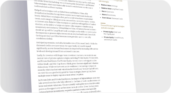 Staying selective through economic transitions Favored hedge fund strategies and The litany of headwinds facing the current global economy includes elevated sub-strategies inflation pressures, a retrenching consumer, restrictive monetary policy, and rising • Relative Value: Arbitrage debt levels. Given this backdrop, we continue to prefer Global Macro and Relative Value strategies, which have historically tended to exhibit lower correlations to • Relative Value: Long/Short Credit traditional stock and bond markets. • Macro: Systematic Hedge Fund strategies, such as Global Macro and Relative Value, offer • Macro: Discretionary diversification benefits through lower correlations to traditional stocks and • Event Driven: Distressed Credit bonds. Global Macro strategies often perform well when there are persistent trends, such rising (or falling) prices in commodities, currencies, equity indexes, or interest rates. Relative Value strategies can perform well regardless of market Favored Private Capital strategies direction, as the ability to hedge out market risks can prove valuable during and sub-strategies recessionary environments. Within Relative Value, we believe the environment • Private Equity: Small- and should set up well for Long/Short Credit strategies, as the ability to isolate price Mid-Cap Buyout discrepancies or generate alpha (excess return over the benchmark) from both the long and short portfolios becomes more prevalent as intra-security • Private Equity: Growth Equity correlations decline. and Venture Capital Anticipating recession, we hold a favorable view of Distressed Credit. While the distressed credits are scarce today, the opportunity set should expand significantly, as over-levered businesses are impacted by increasing debt service levels and slowing demand from a stressed consumer. Lastly, for investors with longer-term investment horizons, we maintain our neutral view of private capital strategies, including Private Equity, Private Debt, and Private Real Estate. For Private Equity, we continue to see opportunities within Small- and Mid-Cap Buyout funds, given the more significant valuation dislocations. While we have seen acute weakness in technology companies recently, which has hurt exit valuations for Growth and Venture Capital funds, we view this as a good entry point for these strategies, knowing they have multiple years to deploy capital at more attractive prices. In Private Debt and Private Real Estate, the impact of higher interest rates may take several months to be fully reflected in the form of credit market stress and lower real estate valuations. We are currently waiting for more attractive entry points as the opportunity set becomes more attractive. Given the long-term nature of private investments, we prefer qualified investors methodically allocate across core Private Capital strategies annually to ensure diversification. 2023 Outlook | 19