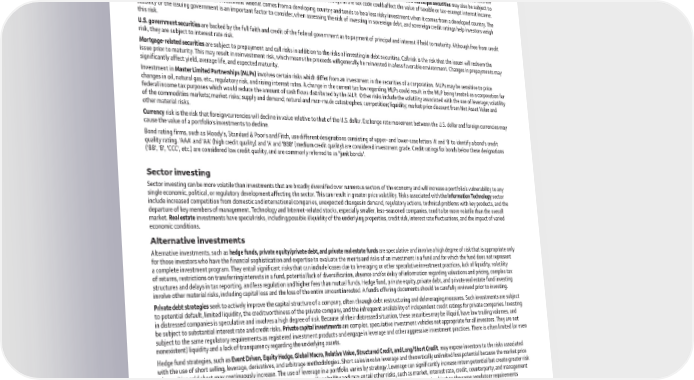 General market risks Stock markets, especially foreign markets, are volatile. A stock’s value may fluctuate in response to general economic and market conditions, the prospects of individual companies, and industry sectors. International investing has additional risks including those associated with currency fluctuation, political and economic instability, and different accounting standards. This may result in greater share price volatility. These risks are heightened in emerging and frontier markets. Investing in small- and mid-cap companies involves additional risks, such as limited liquidity and greater volatility. Investments in fixed-income securities, including municipal securities, are subject to market, interest rate, credit, liquidity, inflation, prepayment, extension, and other risks. Bond prices fluctuate inversely to changes in interest rates. Therefore, a general rise in interest rates can result in a decline in the bond’s price. High-yield fixed-income securities are considered speculative, involve greater risk of default, and tend to be more volatile than investment-grade fixed-income securities. Municipal securities may also be subject to the alternative minimum tax and legislative and regulatory risk, which is the risk that a change in the tax code could affect the value of taxable or tax-exempt interest income. Sovereign debt is generally a riskier investment when it comes from a developing country and tends to be a less risky investment when it comes from a developed country. The stability of the issuing government is an important factor to consider, when assessing the risk of investing in sovereign debt, and sovereign credit ratings help investors weigh this risk. U.S. government securities are backed by the full faith and credit of the federal government as to payment of principal and interest if held to maturity. Although free from credit risk, they are subject to interest rate risk. Mortgage-related securities are subject to prepayment and call risks in addition to the risks of investing in debt securities. Call risk is the risk that the issuer will redeem the issue prior to maturity. This may result in reinvestment risk, which means the proceeds will generally be reinvested in a less favorable environment. Changes in prepayments may significantly affect yield, average life, and expected maturity. Investment in Master Limited Partnerships (MLPs) involves certain risks which differ from an investment in the securities of a corporation. MLPs may be sensitive to price changes in oil, natural gas, etc., regulatory risk, and rising interest rates. A change in the current tax law regarding MLPs could result in the MLP being treated as a corporation for federal income tax purposes which would reduce the amount of cash flows distributed by the MLP. Other risks include the volatility associated with the use of leverage; volatility of the commodities markets; market risks; supply and demand; natural and man-made catastrophes; competition; liquidity; market price discount from Net Asset Value and other material risks. Currency risk is the risk that foreign currencies will decline in value relative to that of the U.S. dollar. Exchange rate movement between the U.S. dollar and foreign currencies may cause the value of a portfolio's investments to decline. Bond rating firms, such as Moody's, Standard & Poor's and Fitch, use different designations consisting of upper- and lower-case letters 'A' and 'B' to identify a bond's credit quality rating. 'AAA' and 'AA' (high credit quality) and 'A' and 'BBB' (medium credit quality) are considered investment grade. Credit ratings for bonds below these designations ('BB', 'B', 'CCC', etc.) are considered low credit quality, and are commonly referred to as "junk bonds". Sector investing Sector investing can be more volatile than investments that are broadly diversified over numerous sectors of the economy and will increase a portfolio’s vulnerability to any single economic, political, or regulatory development affecting the sector. This can result in greater price volatility. Risks associated with the Information Technology sector include increased competition from domestic and international companies, unexpected changes in demand, regulatory actions, technical problems with key products, and the departure of key members of management. Technology and Internet-related stocks, especially smaller, less-seasoned companies, tend to be more volatile than the overall market. Real estate investments have special risks, including possible illiquidity of the underlying properties, credit risk, interest rate fluctuations, and the impact of varied economic conditions. Alternative investments Alternative investments, such as hedge funds, private equity/private debt, and private real estate funds are speculative and involve a high degree of risk that is appropriate only for those investors who have the financial sophistication and expertise to evaluate the merits and risks of an investment in a fund and for which the fund does not represent a complete investment program. They entail significant risks that can include losses due to leveraging or other speculative investment practices, lack of liquidity, volatility of returns, restrictions on transferring interests in a fund, potential lack of diversification, absence and/or delay of information regarding valuations and pricing, complex tax structures and delays in tax reporting, and less regulation and higher fees than mutual funds. Hedge fund, private equity, private debt, and private real estate fund investing involve other material risks, including capital loss and the loss of the entire amount invested. A fund’s offering documents should be carefully reviewed prior to investing. Private debt strategies seek to actively improve the capital structure of a company, often through debt restructuring and deleveraging measures. Such investments are subject to potential default, limited liquidity, the 