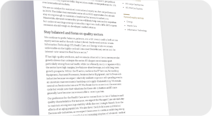 International equity markets face headwinds that ultimately keep us less Favored asset classes favorable compared with U.S. equities through 2023. In aggregate, international earnings growth prospects lag those for the U.S., while sentiment, geopolitical • U.S. Large Cap Equities tensions, and only a partial dollar depreciation reinforce our preference for U.S. • U.S. Mid Cap Equities over international markets. We see no catalyst for sustained international equity market outperformance in 2023. The dollar may surrender some of its 2022 appreciation but should Favored equity sectors stay strong enough to maintain a headwind for international returns. • Energy Meanwhile, elevated commodity prices will likely help commodity exporters but undercut earnings among commodity importers. And a difficult European • Health Care recession should weigh on developed market returns. • Information Technology Stay balanced and focus on quality sectors We continue to prefer balance, patience, and a tilt toward quality, both across equity sectors and at the sub-industry level. Our favored sectors remain Information Technology (IT), Health Care, and Energy, while we remain unfavorable on the highly cyclical Consumer Discretionary sector and the interest-rate-sensitive Real Estate sector.* IT has high-quality attributes, and we remain attracted to the numerous secular growth drivers that underpin the sector. IT’s largest constituents sport particularly strong financial health, while more broadly, many companies within the sector have high margins, low balance-sheet leverage, and solid long-term growth prospects. Within the IT sector, we favor the IT Services, Networking Equipment, Payment Processors, Semiconductor Equipment, and Software sub- industries because we expect relatively resilient corporate tech spending even in an uncertain macroeconomic backdrop and supply chain reshoring. We remain neutral on Semiconductors and PC Hardware due to concerns on the economic cycle but would note that valuations for these sub-industries and IT more generally have become more reasonable in recent quarters. Our preference for the Health Care sector comes from its mix of defensive and quality characteristics. For instance, we expect the Managed Care sub-industry to maintain strong earnings stability while also continuing to benefit from the effects of an aging population. We also favor the Life Sciences and Medical Devices sub-industries, as we expect these areas to continue exhibiting strong and consistent organic growth due to increasing adoption of advanced medical technologies that include biologics, diagnostics, and robotic surgery. We are neutral on large-cap Pharmaceuticals, as we view the fundamentals as balanced — generally strong earnings stability, offset by varying exposure at the company level to pandemic-related product lines (such as vaccines) and a wide spread of pipeline quality. Meanwhile, we remain unfavorable on Generic Pharmaceutical companies, where we continue to believe that fundamentals remain questionable. *Sub-industry analysis prepared by Wells Fargo Advisors Global Securities Research (GSR). For more detailed information at the sub-industry level, please see “2023 Equity Sector Outlook: Balanced and ready”, December 2022. 10 | 2023 Outlook Please see pages 25–27 for important definitions and risk considerations.
