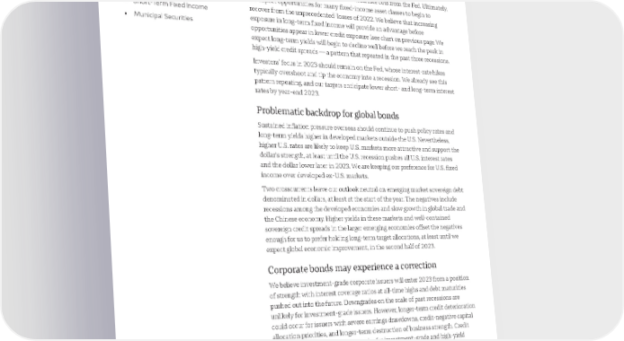 Favored sectors We expect U.S. Treasury yields to decline in 2023 during the economic recession and as investors anticipate eventual rate cuts from the Fed. Ultimately, • Long-Term Fixed Income we expect opportunities for many fixed-income asset classes to begin to 1 • Short-Term Fixed Income recover from the unprecedented losses of 2022. We believe that increasing • Municipal Securities exposure in long-term fixed income will provide an advantage before opportunities appear in lower credit exposure (see chart on previous page. We expect long-term yields will begin to decline well before we reach the peak in high-yield credit spreads — a pattern that repeated in the past three recessions. Investors’ focus in 2023 should remain on the Fed, whose interest-rate hikes typically overshoot and tip the economy into a recession. We already see this pattern repeating, and our targets anticipate lower short- and long-term interest rates by year-end 2023. Problematic backdrop for global bonds Sustained inflation pressure overseas should continue to push policy rates and long-term yields higher in developed markets outside the U.S. Nevertheless, higher U.S. rates are likely to keep U.S. markets more attractive and support the dollar's strength, at least until the U.S. recession pushes all U.S. interest rates and the dollar lower later in 2023. We are keeping our preference for U.S. fixed income over developed ex-U.S. markets. Two crosscurrents leave our outlook neutral on emerging market sovereign debt denominated in dollars, at least at the start of the year. The negatives include recessions among the developed economies and slow growth in global trade and the Chinese economy. Higher yields in these markets and well-contained sovereign credit spreads in the larger emerging economies offset the negatives enough for us to prefer holding long-term target allocations, at least until we expect global economic improvement, in the second half of 2023. Corporate bonds may experience a correction We believe investment-grade corporate issuers will enter 2023 from a position of strength with interest coverage ratios at all-time highs and debt maturities pushed out into the future. Downgrades on the scale of past recessions are unlikely for investment-grade issuers. However, longer-term credit deterioration could occur for issuers with severe earnings drawdowns, credit-negative capital allocation priorities, and longer-term destruction of business strength. Credit spreads (risk premium over Treasuries for investment-grade and high-yield corporate bonds are currently hovering near long-term averages, but we expect that increased volatility and a decline in corporate profits in the upcoming quarters will diminish the appetite for credit risk and cause spreads to widen. 1. Double-digit decline (-13.1%) in the Bloomberg U.S. Aggregate Total Return Bond Index year to date as of November 30, 2022 — the lowest figure since index inception in 1976 14 | 2023 Outlook Please see pages 25–27 for important definitions and risk considerations.