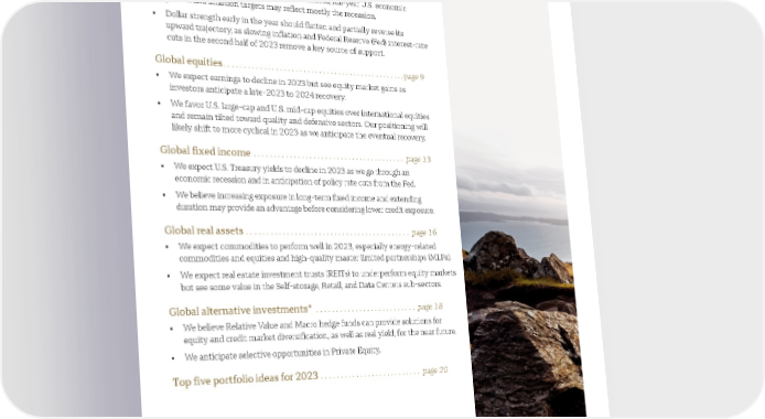 What's inside Economic and market forecasts .............................page 4 Global economy .............................................page 6 • We expect a recession in early 2023, recovery by midyear, and a rebound that gains strength into year-end. Nevertheless, full-year U.S. economic growth and inflation targets may reflect mostly the recession. • Dollar strength early in the year should flatten and partially reverse its upward trajectory, as slowing inflation and Federal Reserve (Fed) interest-rate cuts in the second half of 2023 remove a key source of support. Global equities ...............................................page 9 • We expect earnings to decline in 2023 but see equity market gains as investors anticipate a late-2023 to 2024 recovery. • We favor U.S. large-cap and U.S. mid-cap equities over international equities and remain tilted toward quality and defensive sectors. Our positioning will likely shift to more cyclical in 2023 as we anticipate the eventual recovery. Global fixed income .......................................page 13 • We expect U.S. Treasury yields to decline in 2023 as we go through an economic recession and in anticipation of policy rate cuts from the Fed. • We believe increasing exposure in long-term fixed income and extending duration may provide an advantage before considering lower credit exposure. Global real assets ..........................................page 16 • We expect commodities to perform well in 2023, especially energy-related commodities and equities and high-quality master limited partnerships (MLPs). • We expect real estate investment trusts (REITs) to underperform equity markets but see some value in the Self-storage, Retail, and Data Centers sub-sectors. Global alternative investments* ..........................page 18 • We believe Relative Value and Macro hedge funds can provide solutions for equity and credit market diversification, as well as real yield, for the near future. • We anticipate selective opportunities in Private Equity. Top five portfolio ideas for 2023 ..........................page 20 * Alternative investments are not appropriate for all investors and are only open to “accredited investors” or “qualified investors” within the meaning of the U.S. securities laws. They are speculative, highly illiquid, and designed for long-term investment and not as trading vehicles. Please see pages 25–27 for important definitions and risk considerations. 2023 Outlook | 3