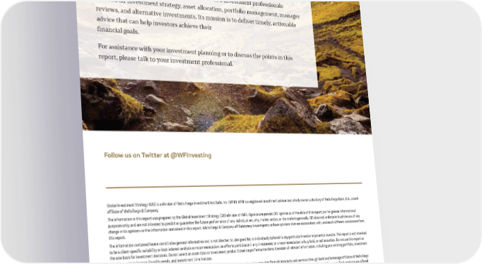 Investment expertise and advice to help you succeed financially Wells Fargo Investment Institute is home to 200 investment professionals focused on investment strategy, asset allocation, portfolio management, manager reviews, and alternative investments. Its mission is to deliver timely, actionable advice that can help investors achieve their financial goals. For assistance with your investment planning or to discuss the points in this report, please talk to your investment professional. Follow us on Twitter at @WFInvesting Global Investment Strategy (GIS) is a division of Wells Fargo Investment Institute, Inc. (WFII). WFII is a registered investment adviser and wholly owned subsidiary of Wells Fargo Bank, N.A., a bank affiliate of Wells Fargo & Company. The information in this report was prepared by the Global Investment Strategy (GIS) division of WFII. Opinions represent GIS’ opinion as of the date of this report; are for general informational purposes only; and are not intended to predict or guarantee the future performance of any individual security, market sector, or the markets generally. GIS does not undertake to advise you of any change in its opinions or the information contained in this report. Wells Fargo & Company affiliates may issue reports or have opinions that are inconsistent with, and reach different conclusions from, this report. The information contained herein constitutes general information and is not directed to, designed for, or individually tailored to any particular investor or potential investor. This report is not intended to be a client-specific suitability or best interest analysis or recommendation; an offer to participate in any investment; or a recommendation to buy, hold, or sell securities. Do not use this report as the sole basis for investment decisions. Do not select an asset class or investment product based on performance alone. Consider all relevant information, including your existing portfolio, investment objectives, risk tolerance, liquidity needs, and investment time horizon. Wells Fargo Wealth and Investment Management, a division within the Wells Fargo & Company enterprise, provides financial products and services through bank and brokerage affiliates of Wells Fargo & Company. Brokerage products and services offered through Wells Fargo Clearing Services, LLC, a registered broker-dealer and nonbank affiliate of Wells Fargo & Company. Bank products are offered through Wells Fargo Bank, N.A. Wells Fargo Advisors is registered with the U.S. Securities and Exchange Commission and the Financial Industry Regulatory Authority but is not licensed or registered with any financial services regulatory authority outside of the U.S. Non-U.S. residents who maintain U.S.-based financial services accounts with Wells Fargo Advisors may not be afforded certain protections conferred by legislation and regulations in their country of residence in respect of any investments, investment transactions, or communications made with Wells Fargo Advisors. Wells Fargo Advisors is a trade name used by Wells Fargo Clearing Services, LLC, and Wells Fargo Advisors Financial Network, LLC, Members SIPC, separate registered broker-dealers and nonbank affiliates of Wells Fargo & Company. © 2022 Wells Fargo Investment Institute. All rights reserved. CAR-1122-03182 0000596232 (Rev. 00, 1 ea.)