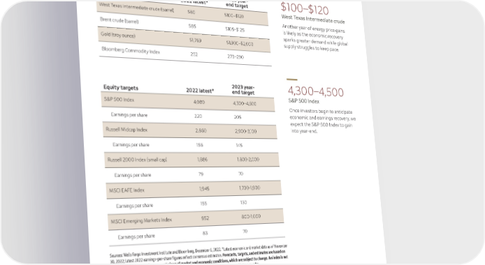 2023 year- $100–$120 Real assets targets 2022 latest* end target West Texas Intermediate crude (barrel) $80 $100–$120 West Texas Intermediate crude Another year of energy price gains Brent crude (barrel) $85 $105–$125 is likely as the economic recovery sparks greater demand while global Gold (troy ounce) $1,769 $1,900–$2,000 supply struggles to keep pace. Bloomberg Commodity Index 252 270–290 2023 year- 4,300–4,500 Equity targets 2022 latest* end target S&P 500 Index S&P 500 Index 4,080 4,300–4,500 Once investors begin to anticipate Earnings per share 220 205 economic and earnings recovery, we expect the S&P 500 Index to gain Russell Midcap Index 2,860 2,900-3,100 into year-end. Earnings per share 156 145 Russell 2000 Index (small cap) 1,886 1,800-2,000 Earnings per share 79 70 MSCI EAFE Index 1,945 1,700-1,900 Earnings per share 155 130 MSCI Emerging Markets Index 952 800-1,000 Earnings per share 83 70 Sources: Wells Fargo Investment Institute and Bloomberg, December 6, 2022. *Latest economic and market data as of November 30, 2022; latest 2022 earnings-per-share figures reflect consensus estimates. Forecasts, targets, and estimates are based on certain assumptions and our current views of market and economic conditions, which are subject to change. An index is not managed and not available for direct investment. Past performance is no guarantee of future results. 2023 Outlook | 5