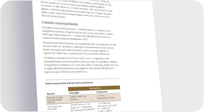 The high-yield market should remain bifurcated with strong credit metrics, especially in double B (BB) ratings but with signs of weakness developing for those securities rated single B (B) and below. The increase in short-term rates that has already taken place will likely stress the lower-quality issuers moving forward as debt service costs increase, leaving less capital available for investment or debt reduction. Currently, we expect high-yield defaults to climb slightly in 2023 but only moving closer toward long-term averages. We prefer higher-quality issuers with stronger balance sheets and cash flows and with relatively better liquidity. Consider municipal bonds We believe municipal bond issuers — backed by federal tax-exempt status, strengthened reserves, strong fiscal governance, conservative debt structures, and budget-balancing powers — are generally well positioned to withstand current economic pressures heading into 2023.* During the past three recessions, municipal bonds have, on average, declined less and recovered the value lost at a faster pace than investment-grade corporate bonds. Municipal credits also continue to carry an average rating that is significantly higher than corporates and with a much lower default rate. We believe a recession in 2023 may result in even stronger demand for municipal bonds, as investors perceive them as a haven for their lower volatility during times of turbulence. We remain favorable on municipals, and for investors in higher effective tax brackets, municipal securities remain relevant and an important part of fixed-income positioning. Fixed-income sector and sub-sector preferences Sub-sectors Sectors Favorable Unfavorable Investment-Grade Utilities, Health Care, Industrials, Corporate bonds Oil & Gas Consumer Discretionary (neutral) Municipal bonds Essential Service and Tax Higher Education (favorable) Supported; Transportation (niche, private institutions) (for more aggressive investors) and Health Care (smaller providers) Sub-sector guidance by Wells Fargo Advisors Global Securities Research group. Sector guidance by Wells Fargo Investment Institute. As of December 6, 2022. *Sub-sector guidance by Wells Fargo Advisors Global Securities Research group. Sector guidance by Wells Fargo Investment Institute. 2023 Outlook | 15