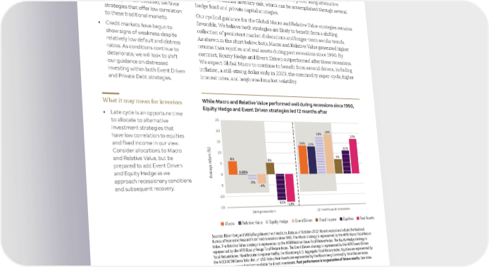 Global alternative investments Opportunities in alternative investments Key takeaways Given the evolving economic downturn, elevated inflation, monetary tightening, and the downward trends in stocks and bonds, we prefer using alternative • While equity and bond market strategies to further diversify risk, which can be accomplished through several volatility remain elevated, we favor hedge fund and private capital strategies. strategies that offer low correlation to these traditional markets. Our cyclical guidance for the Global Macro and Relative Value strategies remains favorable. We believe both strategies are likely to benefit from a shifting • Credit markets have begun to collection of persistent market dislocations and longer-term secular trends. show signs of weakness despite relatively low default and distress As shown in the chart below, both Macro and Relative Value generated higher ratios. As conditions continue to returns than equities and real assets during past recessions since 1990. By deteriorate, we will look to shift contrast, Equity Hedge and Event Driven outperformed after these recessions. our guidance on distressed We expect Global Macro to continue to benefit from several drivers, including investing within both Event Driven inflation, a still-strong dollar early in 2023, the commodity super-cycle, higher and Private Debt strategies. interest rates, and heightened market volatility. What it may mean for investors While Macro and Relative Value performed well during recessions since 1990, Equity Hedge and Event Driven strategies led 12 months after • Late cycle is an opportune time to allocate to alternative 25 investment strategies that 20 18% 19% have low correlation to equities 17% and fixed income in our view. 15 14% 13% Consider allocations to Macro 11% 10 and Relative Value, but be 6% 7% 5 5% prepared to add Event Driven and Equity Hedge as we 0 0.08% approach recessionary conditions Average return (%) -5 -2% and subsequent recovery. -4% -10 -12% -13% -15 During recessions 12 months post recessions Macro Relative Value Equity Hedge Event Driven Fixed Income Equities Real Assets Sources: Bloomberg and Wells Fargo Investment Institute. Data as of October 2022. Recent recessions include the National Bureau of Economic Research’s defined recessions since 1990. The Macro strategy is represented by the HFRI Macro Total Return Index. The Relative Value strategy is represented by the HFRI Relative Value Total Return Index. The Equity Hedge strategy is represented by the HFRI Equity Hedge Total Return Index. The Event Driven strategy is represented by the HFRI Event-Driven Total Return Index. Fixed Income is represented by the Bloomberg U.S. Aggregate Total Return Index. Equities are represented by the MSCI ACWI Gross Total Return USD Index. Real Assets are represented by the Bloomberg Commodity Total Return Index. An index is unmanaged and not available for direct investment. Past performance is no guarantee of future results. See index definitions at end of report. Alternative investments are not appropriate for all investors and are only open to “accredited investors” or “qualified investors” within the meaning of the U.S. securities laws. They are speculative, highly illiquid, and designed for long-term investment and not as trading vehicles. 18 | 2023 Outlook Please see pages 25–27 for important definitions and risk considerations.
