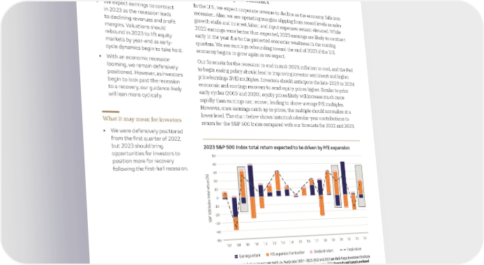 Global equities Stay with quality until broader opportunities emerge Key takeaways Earnings likely to contract • We expect earnings to contract In the U.S., we expect corporate revenue to decline as the economy falls into in 2023 as the recession leads recession. Also, we see operating margins slipping from record levels as sales to declining revenues and profit growth stalls and interest, labor, and input expenses remain elevated. While margins. Valuations should 2022 earnings were better than expected, 2023 earnings are likely to contract rebound in 2023 to lift equity early in the year due to the projected economic weakness in the coming markets by year-end as early- quarters. We see earnings rebounding toward the end of 2023 if the U.S. cycle dynamics begin to take hold. economy begins to grow again as we expect. • With an economic recession Our forecasts for the recession to end in mid-2023, inflation to cool, and the Fed looming, we remain defensively to begin easing policy should lead to improving investor sentiment and higher positioned. However, as investors price/earnings (P/E) multiples. Investors should anticipate the late-2023 to 2024 begin to look past the recession economic and earnings recovery to send equity prices higher. Similar to prior to a recovery, our guidance likely early cycles (2009 and 2020), equity prices likely will increase much more will lean more cyclically. rapidly than earnings can recover, leading to above-average P/E multiples. However, once earnings catch up to prices, the multiple should normalize at a lower level. The chart below shows historical calendar-year contributions to What it may mean for investors return for the S&P 500 Index compared with our forecasts for 2022 and 2023. • We were defensively positioned from the first quarter of 2022, but 2023 should bring 2023 S&P 500 Index total return expected to be driven by P/E expansion opportunities for investors to 50 position more for recovery 40 following the first-half recession. 30 20 10 0 -10 -20 S&P 500 Index total return (%)-30 -40 -50 ’07 ’08 ’09 ’10 ’11 ’12 ’13 ’14 ’15 ’16 ’17 ’18 ’19 ’20 ’21 ’22 ’23 Earnings return P/E expansion/contraction Dividend return Total return Sources: Bloomberg and Wells Fargo Investment Institute. Yearly data: 2007 – 2023. 2022 and 2023 are Wells Fargo Investment Institute estimates. Gray boxes highlight the first year of recoveries in 2009 and 2020 and our forecast in 2023. Forecasts and targets are based on certain assumptions and on our current views of market and economic conditions, which are subject to change. We continue to favor higher-quality U.S. large-cap and mid-cap equities over small-cap equities and international equities. This defensive positioning likely will benefit investors early in the recession. However, equity markets are forward-looking and should begin pricing in a recovery before the recession ends. Our conviction is that investors will find opportunities to increase equity exposure in 2023, likely leaning into more economically sensitive areas of the market. 2023 Outlook | 9