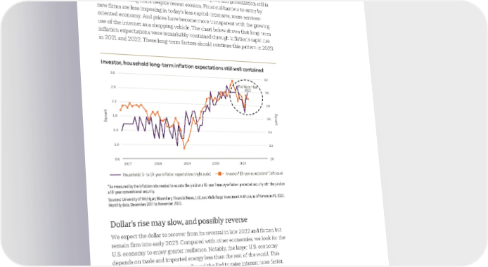 Long-term restraints on inflation are intact and should also contribute to inflation’s reversal lower. Cost-of-living adjustments still are less common in labor negotiations now than they have been in the past, and globalization still is a force containing costs despite recent erosion. Financial barriers to entry by new firms are less imposing in today’s less capital-intensive, more services- oriented economy. And prices have become more transparent with the growing use of the internet as a shopping vehicle. The chart below shows that long-term inflation expectations were remarkably contained through inflation's rapid rise in 2021 and 2022. These long-term factors should continue this pattern in 2023. Investor, household long-term inflation expectations still well contained 3.0 3.2 Mid-November 2.6 2022 3.0 2.2 2.8 Percent 1.8 2.6 Percent 1.4 2.4 1.0 2.2 0.6 2.0 2017 2018 2019 2020 2022 Households' 5- to 10-year inflation expectations (right scale) Investors' 10-year expectations* (left scale) *As measured by the inflation rate needed to equate the yield on a 10-year Treasury inflation-protected security with the yield on a 10-year conventional security. Sources: University of Michigan; Bloomberg Financial News, LLC; and Wells Fargo Investment Institute, as of November 15, 2022. Monthly data, December 2017 to November 2022. Dollar’s rise may slow, and possibly reverse We expect the dollar to recover from its reversal in late 2022 and flatten but remain firm into early 2023. Compared with other economies, we look for the U.S. economy to enjoy greater resilience. Notably, the larger U.S. economy depends on trade and imported energy less than the rest of the world. This comparative independence has allowed the Fed to raise interest rates faster, further, and more aggressively than other developed market central banks. Comparatively higher U.S. interest rates and the perceived safe haven status of the dollar reinforced the greenback's global strength in 2022. 2023 Outlook | 7