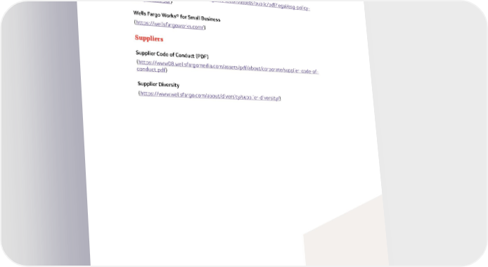 97 Wells Fargo Asset Management ESG Policy and Process (PDF) ( https://www .wellsfargoassetmanagement .com/assets/public/pdf/legal/esg-policy- and-process .pdf ) Wells Fargo W orksĀ® for Small Business ( https://wellsfargoworks .com/ ) Suppliers Supplier Code of Conduct (PDF) ( https://www08 .wellsfargomedia .com/assets/pdf/about/corporate/supplier-code-of- conduct .pdf ) Supplier Diversity ( https://www .wellsfargo .com/about/diversity/supplier-diversity/ )