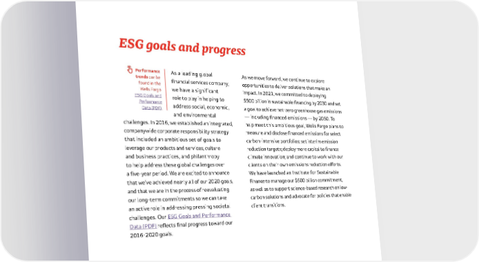 10 ESG goals and progress Performance trends can be found in the Wells Fargo ESG Goals and Performance Data (PDF) . As a leading global financial services company, we have a significant role to play in helping to address social, economic, and environmental challenges . In 2016, we established an integrated, companywide corporate responsibility strategy that included an ambitious set of goals to leverage our products and services, culture and business practices, and philanthropy to help address these global challenges over a five-year period . We are excited to announce that we’ve achieved nearly all of our 2020 goals, and that we are in the process of reevaluating our long-term commitments so we can take an active role in addressing pressing societal challenges . Our ESG Goals and Performance Data (PDF) reflects final progress toward our 2016-2020 goals . As we move forward, we continue to explore opportunities to deliver solutions that make an impact . In 2021, we committed to deploying $500 billion in sustainable financing by 2030 and set a goal to achieve net-zer o greenhouse gas emissions — including financed emissions — by 2050 . To help meet this ambitious goal, Wells F argo plans to measure and disclose financed emissions for select carbon-intensive por tfolios; set interim emission reduction targets; deploy more capital to finance climate innovation; and continue to work wi th our clients on their own emissions reduction efforts . We have launched an Institute for Sustainable Finance to manage our $500 billion commitment, as well as to suppor t science-based research on low- carbon solutions and adv ocate for policies that enable client transitions .