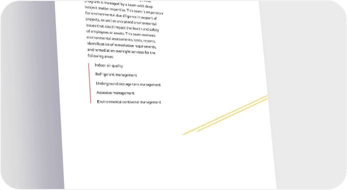 90 Environmental risk and compliance Our Environmental Risk and Compliance program is managed by a team with deep subject matter expertise . This team is responsible for environmental due diligence in support of projects, as well as unplanned environmental issues that could impact the health and safety of employees or assets . This team oversees environmental assessments, tests, reports, identification of remediation requirements, and remediation oversight services for the following areas: Indoor air quality Refrigerant management Underground storage tank management Asbestos management Environmental contractor management