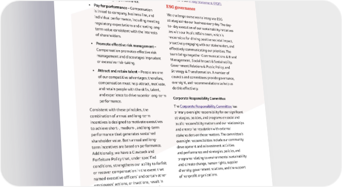19 Our executive compensation programs are designed and administered in accordance with the following compensation principles, each of which is an essential component in driving strong, risk-managed performance . • Pay for performance – Compensation is linked to company, business line, and individual performance, including meeting regulatory expectations and creating long- term value consistent with the interests of shareholders . • Promote effective risk management – Compensation promotes effective risk management and discourages imprudent or excessive risk-taking . • Attract and retain talent – People are one of our competitive advantages; therefore, compensation must help attract, motivate, and retain people with the skills, talent, and experience to drive superior long-term performance . Consistent with these principles, the combination of annual and long-term incentives is designed to motivate executives to achieve short-, medium-, and long-term performance that generates sustained shareholder value . Both annual and long- term incentives are based on performance . Additionally, we have a Clawback and Forfeiture Policy that, under specified conditions, strengthens our ability to forfeit or recover compensation in the event that named executive officers’ and certain other employees’ actions, or inactions, result in specified types of negative outcomes for our company . Our named executive officers are those executive officers for whom disclosure is included in the Compensation Discussion and Analysis and related compensation disclosures contained in our Proxy Statement (PDF) . ESG governance We challenge ourselves to integrate ESG strategies into our business every day . The day- to- day execution of our sustainability initiatives lies with our Public Affairs team, which is responsible for driving positive societal impact, proactively engaging with our stakeholders, and effectively communicating our priorities . The team brings together Communications & Brand Management, Social Impact & Sustainability, Government Relations & Public Policy, and Strategy & Transformation . A number of councils and committees provide governance, oversight, and recommendations to help us do this effectively . Corporate Responsibility Committee The Corporate Responsibility Committee has primary oversight responsibility for our significant strategies, policies, and programs on social and public responsibility matters and our relationships and enterprise reputation with external stakeholders on those matters . The committee’s oversight responsibilities include our community development and reinvestment activities and performance and strategies, policies, and programs relating to environmental sustainability and climate change, human rights, supplier diversity, government relations, and the support of nonprofit organizations .
