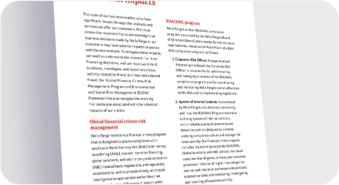 75 BSA/AML program Wells Fargo’s written BSA/AML compliance program is approved by the Wells Fargo’s Board of Directors (Board) and provides for the minimum requirements, known as the ‘Four Pillars’ of a BSA/ AML compliance program,1 as follows: 1. Corporate BSA Officer: As appointed and directed by the Board, the Corporate BSA Officer is responsible for administering and managing all aspects of the BSA/AML compliance program and for coordinating and monitoring Wells Fargo’s overall adherence to the BSA and its implementing regulations . 2. System of Internal Controls: As mandated by Wells Fargo’s size, structure, complexity, and risks, the BSA/AML Program maintains a strong system of internal controls, which includes a suite of preventive and detective controls designed to promote a strong compliance culture and manage risk transparently . Our financial crimes program includes maintaining corporate BSA/AML, Global Sanctions, and ABC policies; risk based customer due diligence, or know your customer, processes inclusive of higher risk categories such as cash intensive businesses and politically exposed persons; and monitoring, investigating, and reporting of suspicious activity . The scale of our business enables us to have significant impact through the products and services we offer our customers . With that comes the responsibility to acknowledge that business decisions made by Wells Fargo or our customers may have adverse impacts on people and the environment . To mitigate these impacts, we need to understand the inherent risk in our financing decisions, and we must work hard to detect, investigate, and report suspicious activity related to financial crimes and external fraud . Our Global Financial Crimes Risk Management Program and Environmental and Social Risk Management (ESRM) Framework help us navigate the evolving risk landscape associated with the potential impacts of our clients . Global financial crimes risk management Wells Fargo maintains a financial crimes program that is designed to assure compliance with applicable Bank Secrecy Act (BSA)/anti-money laundering (AML), counter-terrorist financing, global sanctions, and anti-bribery and corruption (ABC) related laws, regulations, and regulatory expectations, and to provide timely, actionable intelligence to appropriate authorities that may be indicative of financial crimes in order to safeguard the company, its employees, our customers, our communities, other stakeholders, and the global financial system . Understanding environmental and social impacts 1 . While different regulators consider CDD a fifth pillar, the Wells Fargo BSA/AML and Global Sanctions Compliance Program includes it in the internal controls pillar to be consistent with the Office of the Comptroller of the Currency view of the four pillars .