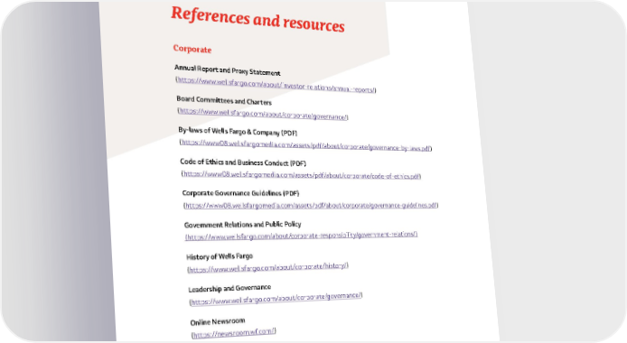 92 References and resources Corporate Annual Report and Proxy Statement ( https://www .wellsfargo .com/about/investor-relations/annual-reports/ ) Board Committees and Charters ( https://www .wellsfargo .com/about/corporate/governance/ ) By-laws of Wells Fargo & Company (PDF) ( https://www08 .wellsfargomedia .com/assets/pdf/about/corporate/governance-by-laws .pdf ) Code of Ethics and Business Conduct (PDF) ( https://www08 .wellsfargomedia .com/assets/pdf/about/corporate/code-of-ethics .pdf ) Corporate Governance Guidelines (PDF) ( https://www08 .wellsfargomedia .com/assets/pdf/about/corporate/governance-guidelines .pdf ) Government Relations and Public Policy (https:// www .wellsfargo .com/about/corporate-responsibility/government-relations/) History of Wells Fargo ( https://www .wellsfargo .com/about/corporate/history/ ) Leadership and Governance ( https://www .wellsfargo .com/about/corporate/governance/ ) Online Newsroom ( https://newsroom .wf .com/ ) Wells Fargo Stories ( https://stories .wf .com/?cid=vty ) Wells Fargo Today Quarterly Fact Sheet (PDF) ( https://www08 .wellsfargomedia .com/assets/pdf/about/corporate/wells-fargo-today .pdf )