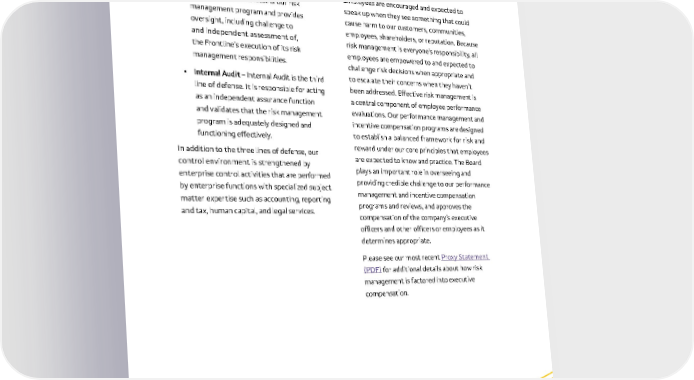 25 • Independent Risk Management (IRM) – IRM is the second line of defense . It establishes and maintains our risk management program and provides oversight, including challenge to and independent assessment of, the Frontline’s execution of its risk management responsibilities . • Internal Audit – Internal Audit is the third line of defense . It is responsible for acting as an independent assurance function and validates that the risk management program is adequately designed and functioning effectively . In addition to the three lines of defense, our control environment is strengthened by enterprise control activities that are performed by enterprise functions with specialized subject matter expertise such as accounting, reporting and tax, human capital, and legal services . Risk and culture Employees are encouraged and expected to speak up when they see something that could cause harm to our customers, communities, employees, shareholders, or reputation . Because risk management is everyone’s responsibility, all employees are empowered to and expected to challenge risk decisions when appropriate and to escalate their concerns when they haven’t been addressed . Effective risk management is a central component of employee performance evaluations . Our performance management and incentive compensation programs are designed to establish a balanced framework for risk and reward under our core principles that employees are expected to know and practice . The Board plays an important role in overseeing and providing credible challenge to our performance management and incentive compensation programs and reviews, and approves the compensation of the company’s executive officers and other officers or employees as it determines appropriate . Please see our most recent Proxy Statement (PDF) for additional details about how risk management is factored into executive compensation .