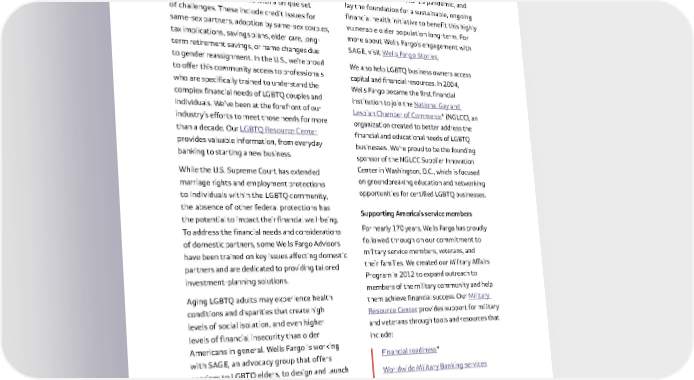 43 Addressing unique LGBTQ community needs For members of the LGBTQ community, financial planning needs, from the simple to the complex, can come with a unique set of challenges . These include credit issues for same-sex partners, adoption by same-sex couples, tax implications, savings plans, elder care, long- term retirement savings, or name changes due to gender reassignment . In the U .S ., we’re proud to offer this community access to professionals who are specifically trained to understand the complex financial needs of LGBTQ couples and individuals . We’ve been at the forefront of our industry’s efforts to meet those needs for more than a decade . Our LGBTQ Resource Center provides valuable information, from everyday banking to starting a new business . While the U .S . Supreme Court has extended marriage rights and employment protections to individuals within the LGBTQ community, the absence of other federal protections has the potential to impact their financial well-being . To address the financial needs and considerations of domestic partners, some Wells Fargo Advisors have been trained on key issues affecting domestic partners and are dedicated to providing tailored investment-planning solutions . Aging LGBTQ adults may experience health conditions and disparities that create high levels of social isolation, and even higher levels of financial insecurity than older Americans in general . Wells Fargo is working with SAGE, an advocacy group that offers services to LGBTQ elders, to design and launch a Financial Resiliency Center for LGBTQ Older People . This online financial health program is expected to immediately contribute to financial health and planning for LGBTQ elders during the COVID-19 pandemic, and lay the foundation for a sustainable, ongoing financial health initiative to benefit this highly vulnerable older population long-term . For more about Wells Fargo’s engagement with SAGE, visit Wells Fargo Stories . We also help LGBTQ business owners access capital and financial resources . In 2004, Wells Fargo became the first financial institution to join the National Gay and Lesbian Chamber of Commerce * (NGLCC), an organization created to better address the financial and educational needs of LGBTQ businesses . We’re proud to be the founding sponsor of the NGLCC Supplier Innovation Center in Washington, D .C ., which is focused on groundbreaking education and networking opportunities for certified LGBTQ businesses . Supporting America’s service members For nearly 170 years, Wells Fargo has proudly followed through on our commitment to military service members, veterans, and their families . We created our Military Affairs Program in 2012 to expand outreach to members of the military community and help them achieve financial success . Our Military Resource Center provides support for military and veterans through tools and resources that include: Financial readiness * Worldwide Military Banking services Mortgage services Servicemembers Civil Relief Act benefits *We do not control this website . Wells Fargo has provided this link for your convenience, but does not endorse and is not responsible for the content, links, privacy policy, or security policy of this website .