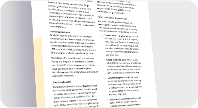 63 Commuter benefits Employees in the U .S . who drive to work and pay for parking, or who take public transportation, are able to use pretax dollars deducted from their paycheck to help cover monthly commuting costs . In certain international locations, Wells Fargo provides government-supported cycle-to-work benefits . In several countries, we also provide commuting plans and interest-free season ticket loans to support employees using public transit . In addition, free busing is offered to employees in India and the Philippines, providing transportation to and from work . Time away from work At Wells Fargo, we understand that employees have busy lives and diverse needs . Our time away benefit provides a variety of competitive options to accommodate diverse needs, including time off for vacation, illness, volunteering, the loss of a family member, and other significant life events . Wells Fargo offers leave for such civic duties as voting, jury duty, and military leave . In the U .S ., more than 200 of our employees are on military leave at any given time . Across the globe, Wells Fargo supports military leave and reservist options for employees . Education benefits Our education benefits help employees and their families attain their educational pursuits through accredited institutions . In the U .S ., Wells Fargo’s tuition reimbursement benefit is available for eligible classes, required books, and certain fees up to $5,000 per calendar year for eligible regular employees, and up to $2,500 per calendar year for part-time employees . The program is also available in some of our international locations, reaching approximately 80% of our international employees . Reimbursement amounts are set at appropriate levels reflecting regional educational costs . Employees and their immediate family members also have access to free or discounted courses, webinars, and resources from participating organizations or universities . In the U .S ., we administer our Team Members’ Dependent Children Scholarship Program, which awards scholarships ranging from $1,000 to $3,000 for full-time undergraduate or graduate study . Family planning and dependent care In the U .S ., Wells Fargo offers several family planning and dependent care benefits, including paid leaves to provide employees with time away from work to help care for loved ones, including: • Parental leave – For U .S . employees to care for a new child following birth or adoption, Wells Fargo provides up to 16 weeks of paid parental leave for a primary caregiver and up to four weeks for a parent who isn’t the primary caregiver (available after one full year of service) . • Critical caregiving leave – One regularly scheduled workweek per year of paid critical caregiving leave is available to employees to care for a spouse, partner, parent, or child with a certified serious health condition . • Lactation support – We offer lactation support for nursing mothers by providing dedicated rooms in the workplace, access to lactation consultants, and a breast milk shipping program for nursing mothers traveling on business . • Adoption reimbursement – We provide up to $5,000 for eligible adoption- related expenses through our Adoption Reimbursement Program . • Insurance coverage for family planning – Through Wells Fargo’s medical insurance plans, employees can receive coverage for fertility services and contraception .