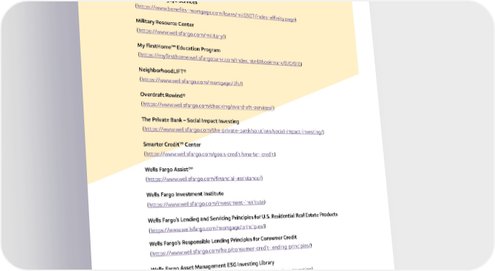96 LGBTQ Resource Center ( https://www .wellsfargo .com/lgbtq/ ) Military Mortgage Services ( https://www .benefits-mortgage .com/loans/mil0307/index-affinity .page ) Military Resource Center ( https://www .wellsfargo .com/military/ ) My FirstHome SM Education Program ( https://myfirsthome .wellsfargobank .com/index .html#bookmark/0/0/0/0 ) NeighborhoodLIFT® ( https://www .wellsfargo .com/mortgage/lift/ ) Overdraft R ewind® ( https://www .wellsfargo .com/checking/overdraft-services/ ) The Private Bank – Social Impact Investing ( https://www .wellsfargo .com/the-private-bank/solutions/social-impact-investing/ ) Smarter Credit TM Center ( https://www .wellsfargo .com/goals-credit/smarter-credit ) Wells Fargo Assist SM ( https://www .wellsfargo .com/financial-assistance/ ) Wells Fargo Investment Institute ( https://www .wellsfargo .com/investment-institute ) Wells Fargo’s Lending and Servicing Principles for U.S. Residential Real Estate Products ( https://www .wellsfargo .com/mortgage/principles/ ) Wells Fargo’s Responsible Lending Principles for Consumer Credit ( https://www .wellsfargo .com/help/consumer-credit-lending-principles/ ) Wells Fargo Asset Management ESG Investing Library ( https://www .wellsfargoassetmanagement .com/insights/esg-investing )